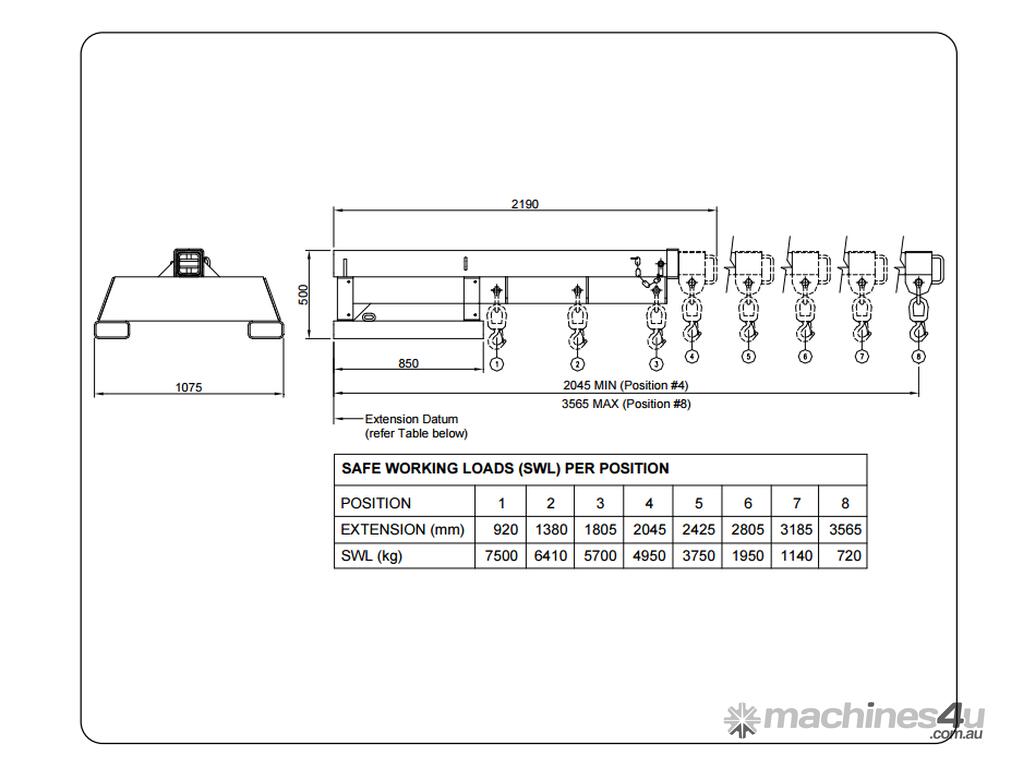 The type SFJL7.5 Fixed Jib (Long) is designed as an affordable general purpose Jib with a 3.56 meter reach when fully extended. This Jib has been designed with wide pockets suitable for Forklifts with special hydraulic Tyne Positioners. This slip-on Forklift attachment is held to the Forklift by a safety chain. The Jibs overall length when closed is 2.19 metres. Supplied with safety swivel Hook and Shackle.