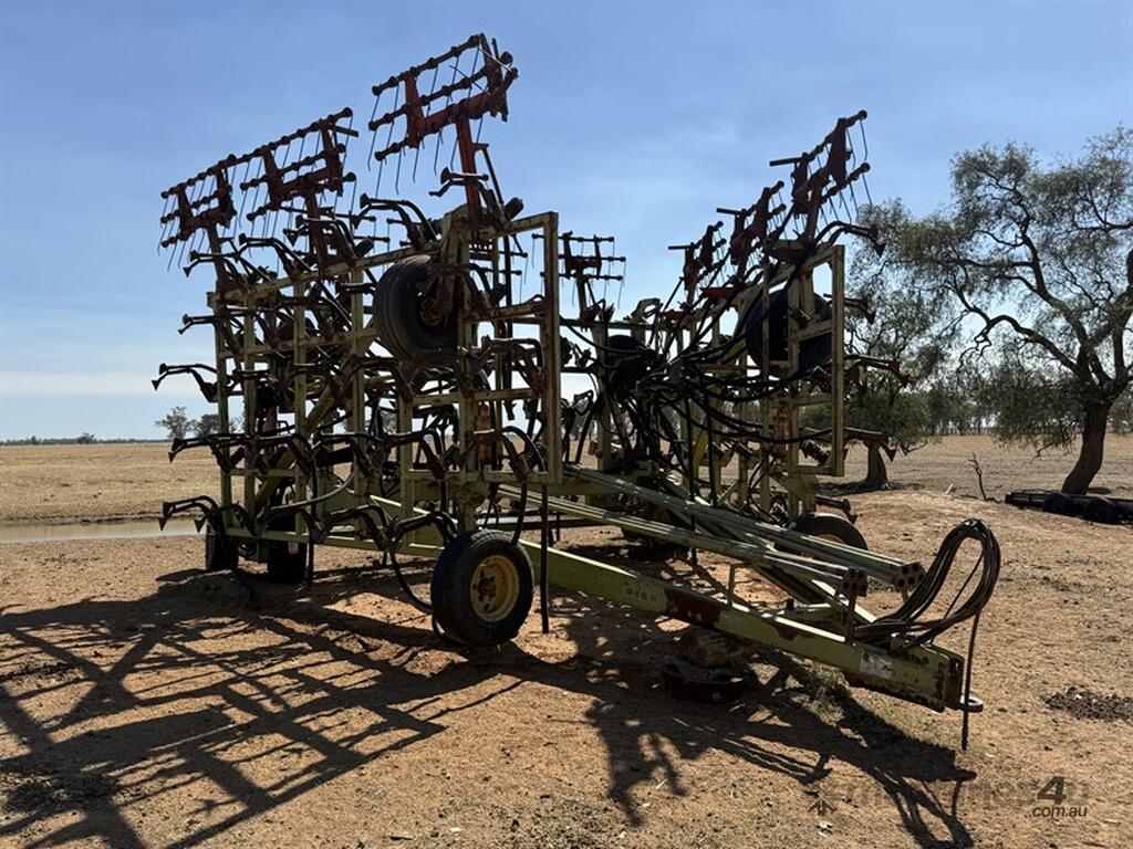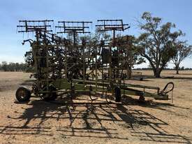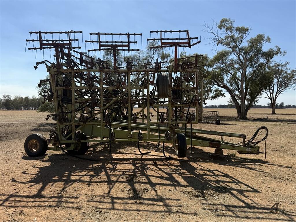 Circa 1988 AFM Allfarm 530 cultivator, Serial Number:1187. Machine fitted with air kit to suit John Shearer, hard-faced knock-on points and finger tine harrows. Four new tyres fitted to travel axles. Approximate travel width of 6.8 metres. Last used some years ago.