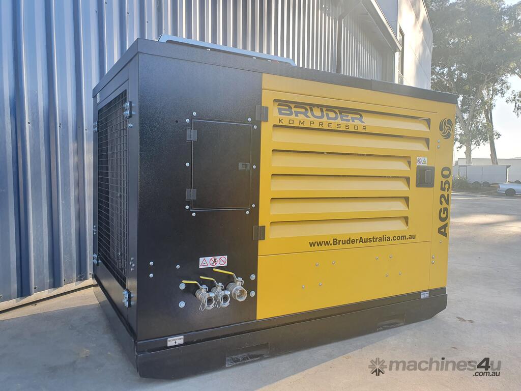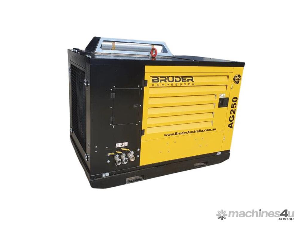 With a smaller footprint and better designed layout than many other compressors in it’s class, the Brüder AG250 can be supplied either on a heavy duty braked trailer (unbraked option not available) on mounted to a forkliftable steel skid for portability, or (permanently) mounted to a service/comb trailer, ute, or truck tray.
