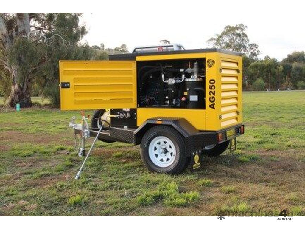 The AG250 chassis has 3 foot pads which are integral to the design of the machine, placed in a manner to facilitate even load distribution when lifting from the top. As such, the compressor is best fitted to a skid or a trailer for portability. However, the skid can be omitted for permanent installation to a truck tray, service trailer or similar.