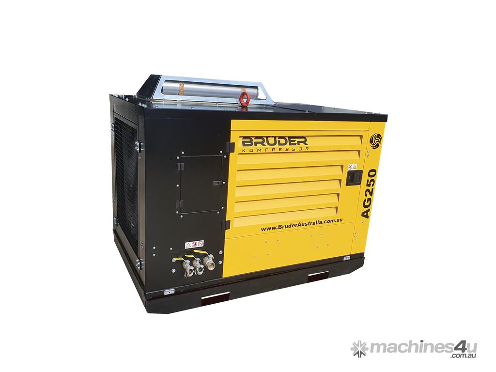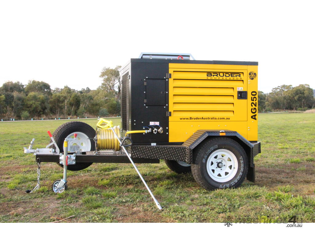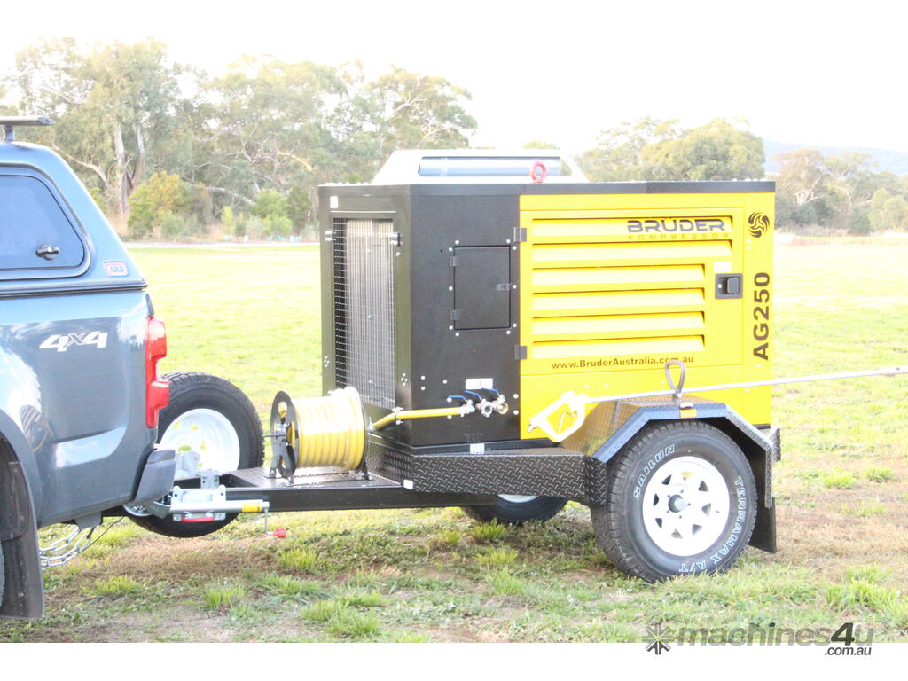 With a smaller footprint and better designed layout than many other compressors in it’s class, the Brüder AG250 can be supplied either on a heavy duty braked trailer (unbraked option not available) on mounted to a forkliftable steel skid for portability, or (permanently) mounted to a service/comb trailer, ute, or truck tray.