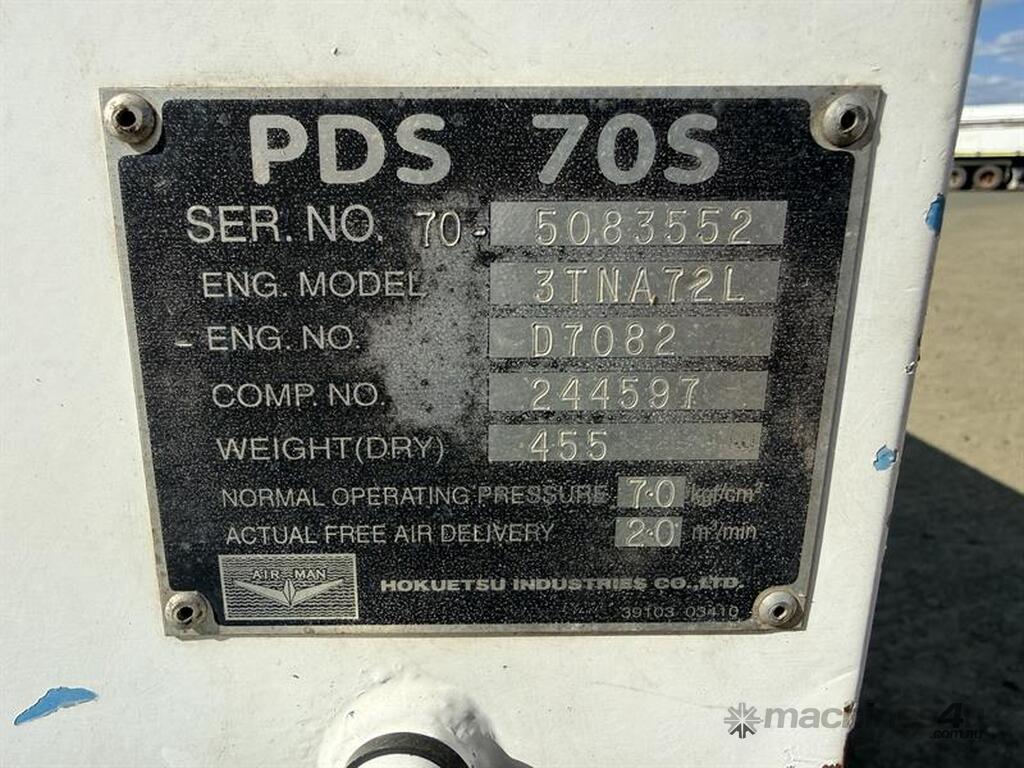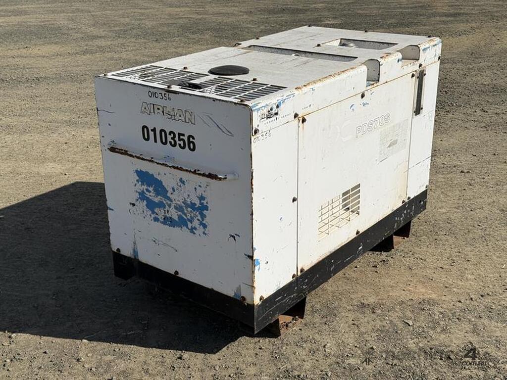 AIRMAN PDS 70S AIR COMPRESSOR, S/N: 5083552, E/N: D7082, 3,374 HOURS SHOWING. LOCATION: HALFERTY STREET, EMERALD, QLD 4720. INSPECTIONS & COLLECTIONS: MONDAY TO FRIDAY, 8AM TO 4PM. ENQUIRIES: RYAN OGDEN BROWN ON OR RYANEMERALDAUCTIONCENTRE