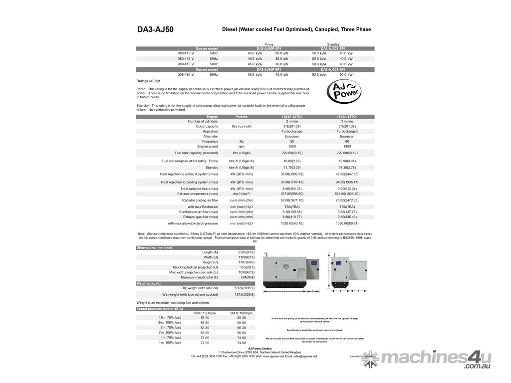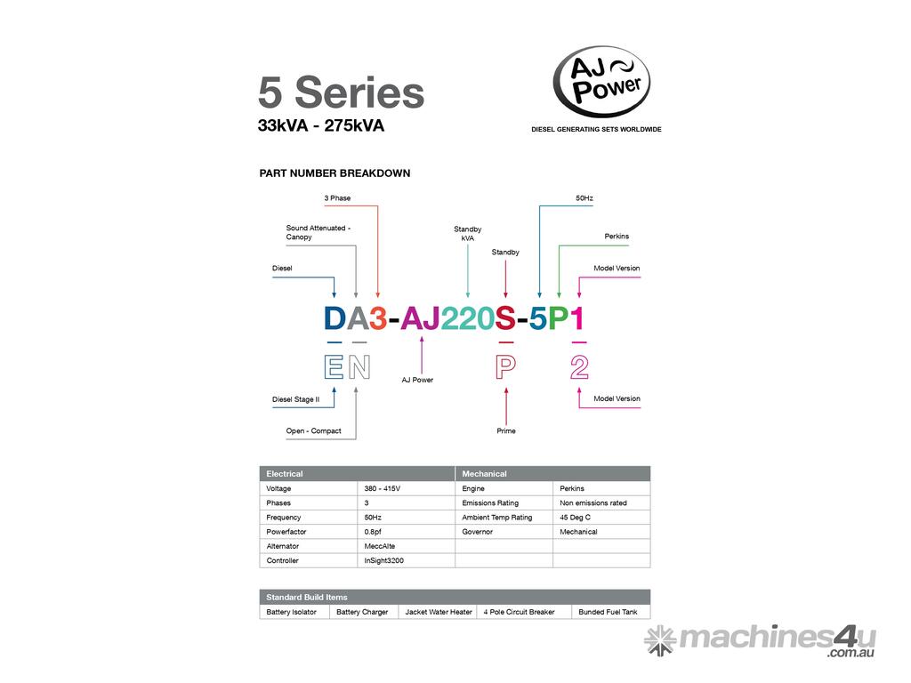 AJ50S comes with standard build items - battery isolator, battery charger, jacket water heater, 4 pole circuit breaker, bunded fuel tank.