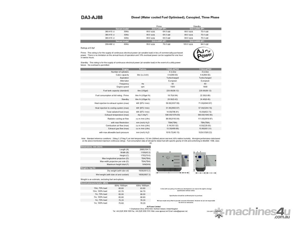 Content: The AJ Power AJ88S is a highly durable three phase four pole diesel generator from the 5 Series range. This model has a standby power capacity of 88kVA and prime power capacity of 80kVA to deliver exceptional performance with low operating costs.