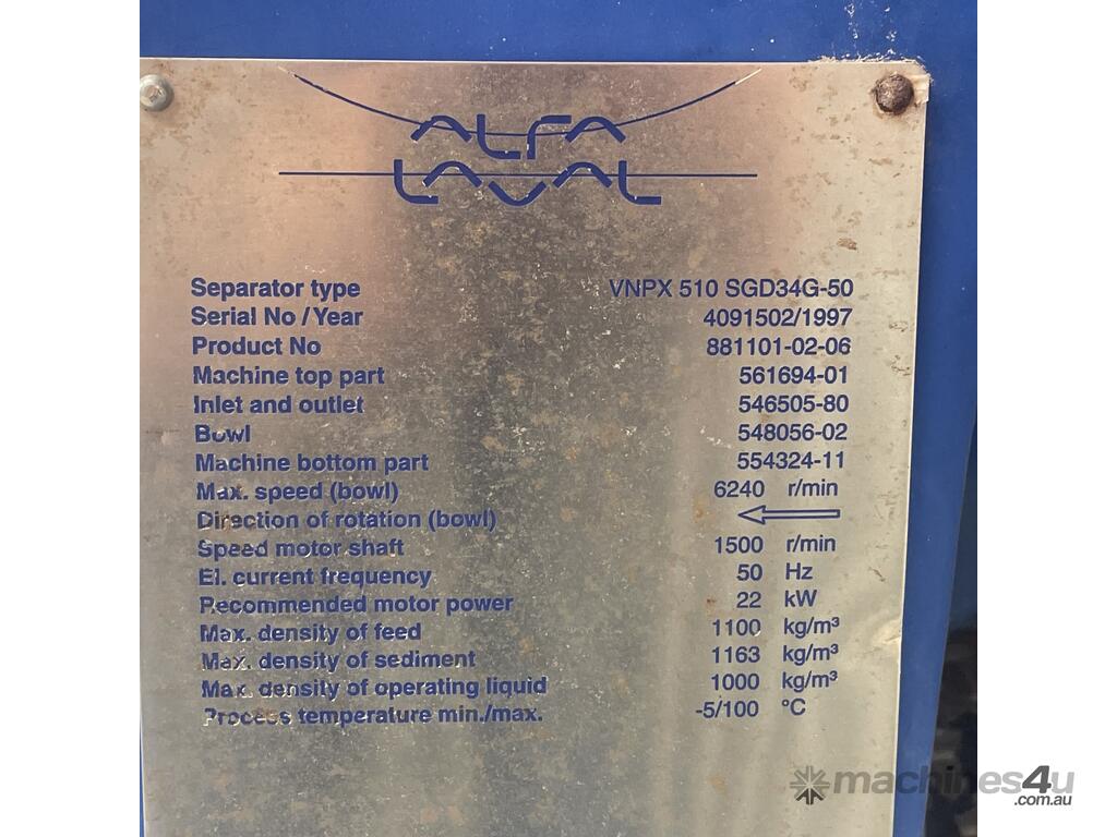 ALFA-LAVAL VNPX 510 SGD34G-50 CLARIFIER CENTRIFUGE SEPARATOR 6240rpm 316SS