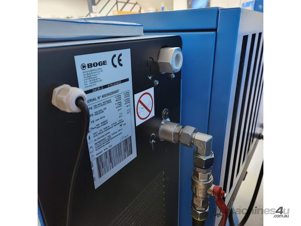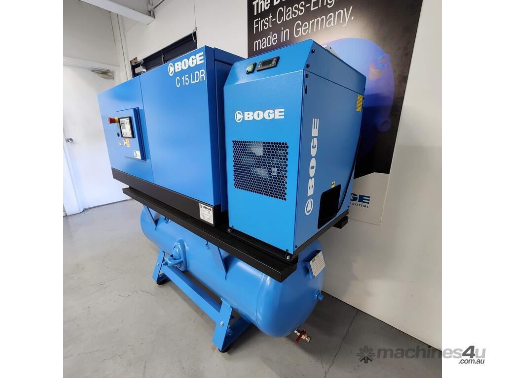 Ultimate Quality German designed and manufactured 11Kw, Direct Drive, Silenced rotary screw compressor mounted on a 350-litre receiver tank and fitted with Boge 'on board' refrigerated air dryer. This full feature package will provide 60cfm at 10 bar pressure and is ideal for operating inside your factory—the perfect unit for cabinet makers or small engineering workshops.