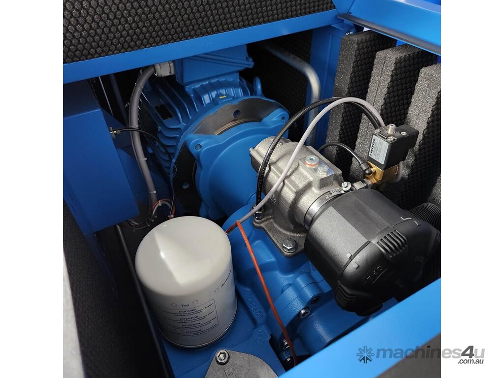 High-Quality German Made oil-injected screw compressor with rotorcomp encapsulated airend. aftercooler and refrigeration dryer are included in this ultra-compact design. Simply analogue dash for critical readings. Prefilter on air intake helps maintain unit health. 2000-hour service intervals and a 2-year warranty on all RENNER new product sales.