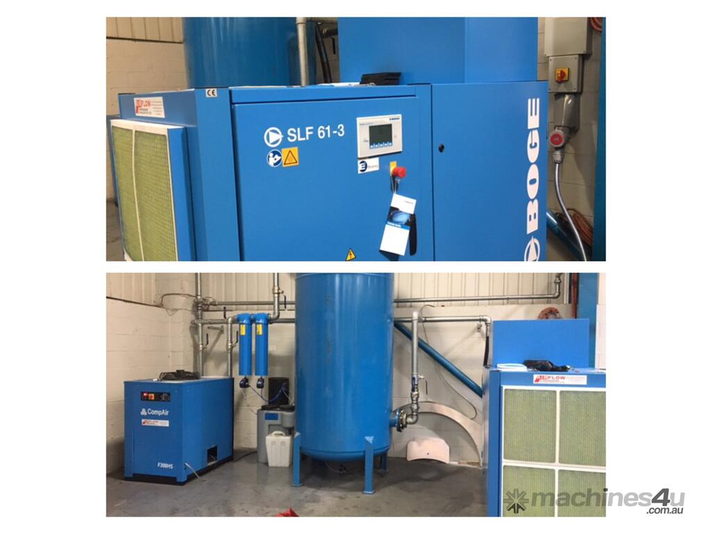 Description: BOGE SLF 61-3 screw compressor air-cooled, with integral frequency regulation max. pressure: 8 bar (125 psi) operating voltage: 400 V frequency: 50 Hz focus control 2.0. Super noise reduced First oil filling BOGE 3000plus