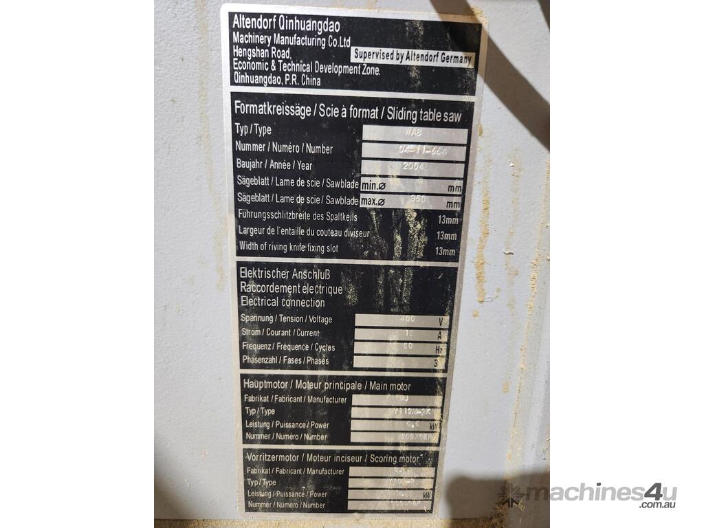 1. ALTENDORF WA8 3.2m TILT PANEL SAW Year 2004 BOUGHT NEW, 1 OWNER. 45deg TILT, 5.5kw 7.5hp 415v, SEPARATE SCRIBER MOTOR, ELECTRIC RISE/FALL/TILT, 350mm BLADE, OVERHEAD GUARD. IN ABOVE AVERAGE CONDITION INCLUDING OPERATOR MANUALS, ONLY USED AS IN-HOUSE BACK-UP SAW, ACCESSORIES, TOOLS. QUICK SALE. INCLUDING CUSTOM BUILT EXTENSION TABLE FOR LARGE SHEETS. READY TO GO! REQUEST EXTRA PHOTOS.