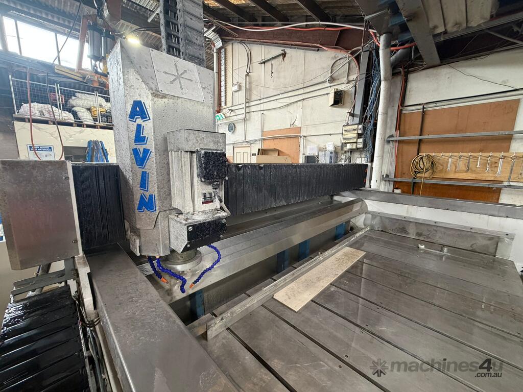 ALVIN CNC Router in working condition, currently configured for stone processing with water cooling system only and operated using Aspire software.