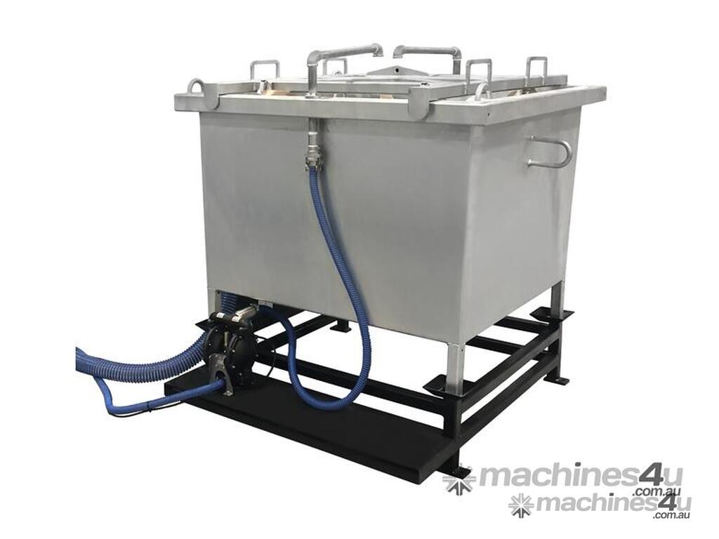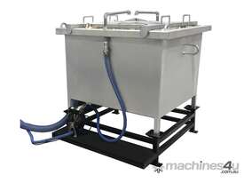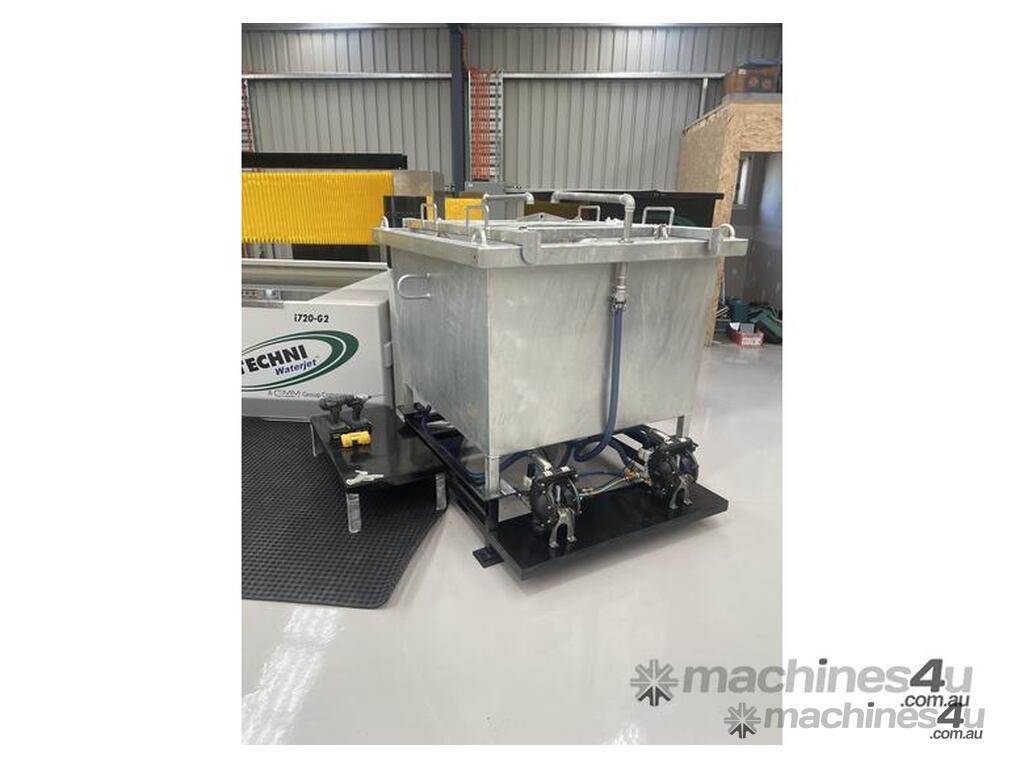 The abrasive slurry is then pumped to a heavy-duty bin by an abrasive resistant diaphragm pump. The abrasive settles inside the bag while the water is returned to the Waterjet tank.