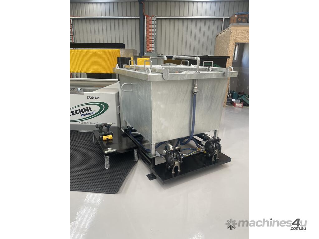The abrasive slurry is then pumped to a heavy-duty bin by an abrasive resistant diaphragm pump. The abrasive settles inside the bag while the water is returned to the Waterjet tank.