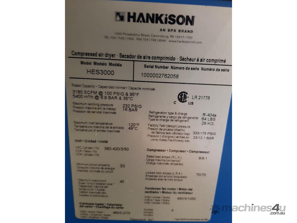 8). HANKISON SPX HES3000 3,180CFM 16 BAR 415v REFRIGERATED AIR DRYER Year 2015 MADE IN USA, HEAVY DUTY, AS NEW CONDITION. FEATURING 'COLD WAVE TECHNOLOGY'