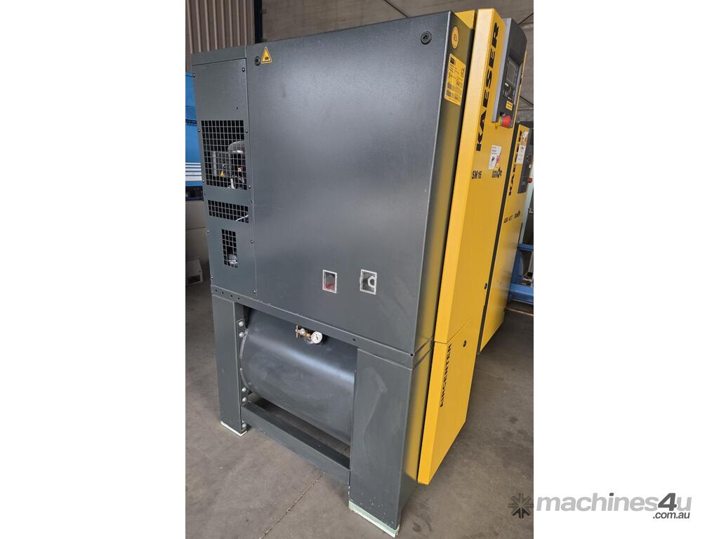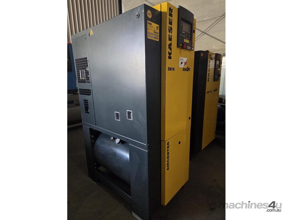 2). KAESER AIRCENTER SM16 9kw 12hp 415v 8 BAR 3-IN-1 FULLY-FEATURED ROTARY SCREW COMPRESSOR Year 6/2020 INCLUDING BUILT-IN REFRIGERATED AIR DRYER / FILTERS MOUNTED ON 270 LITRE AIR RECEIVER AIR TANK, SIGMA 2 ELECTRONIC CONTROLLER, RFID SERVICE OPTION INCLUDING SWIPE CARD, MADE IN GERMANY, VERY LOW RUN HOURS, SUPER QUIET, HEAVY DUTY, VERY COMPACT FOOTPRINT, 1 OWNER, AS NEW CONDITION. REQUEST BROCHURE.