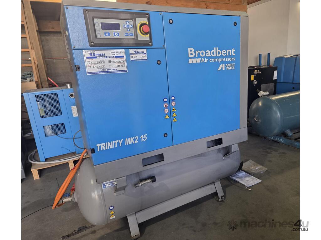 3). BROADBENT (ANEST IWATA) TRINITY MK 15kw 20hp 415v 8 BAR 3-IN-1 FULLY FEATURED ROTARY SCREW COMPRESSOR Year 2019 MADE IN ITALY, INCLUDING BUILT-IN REFRIGERATED AIR DRYER 240v MOUNTED ON 270 LITRE AIR RECEIVER TANK, GENUINE HOURS, VERY COMPACT, HEAVY DUTY. TOP QUALITY. BARGAIN!