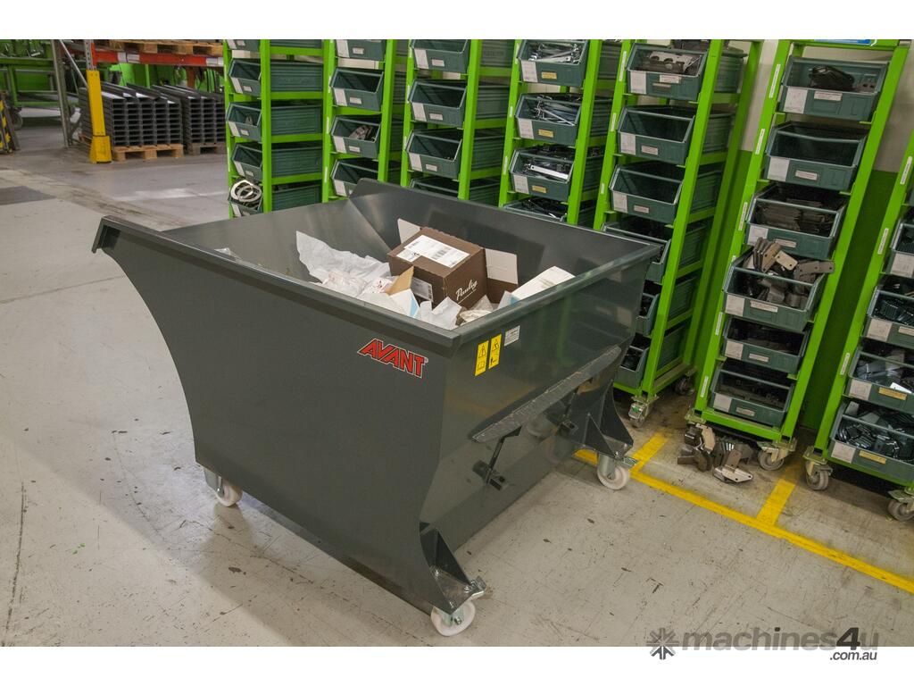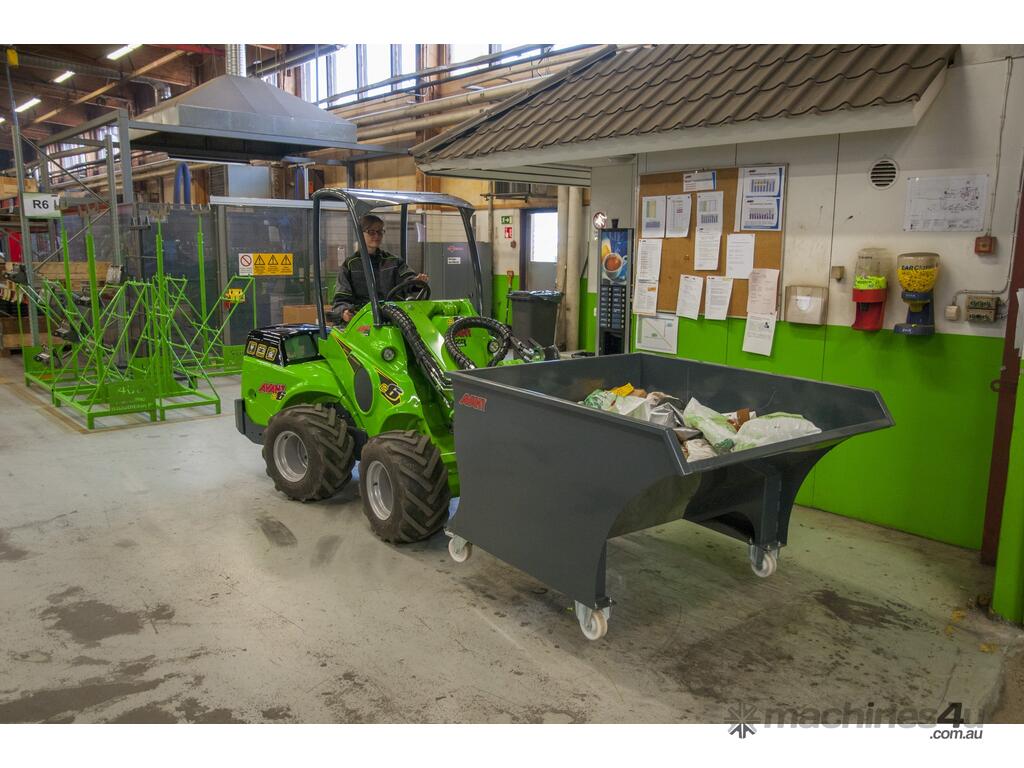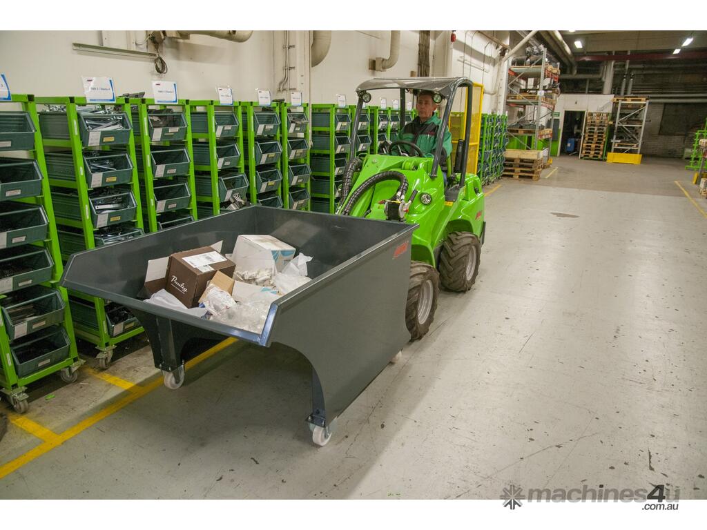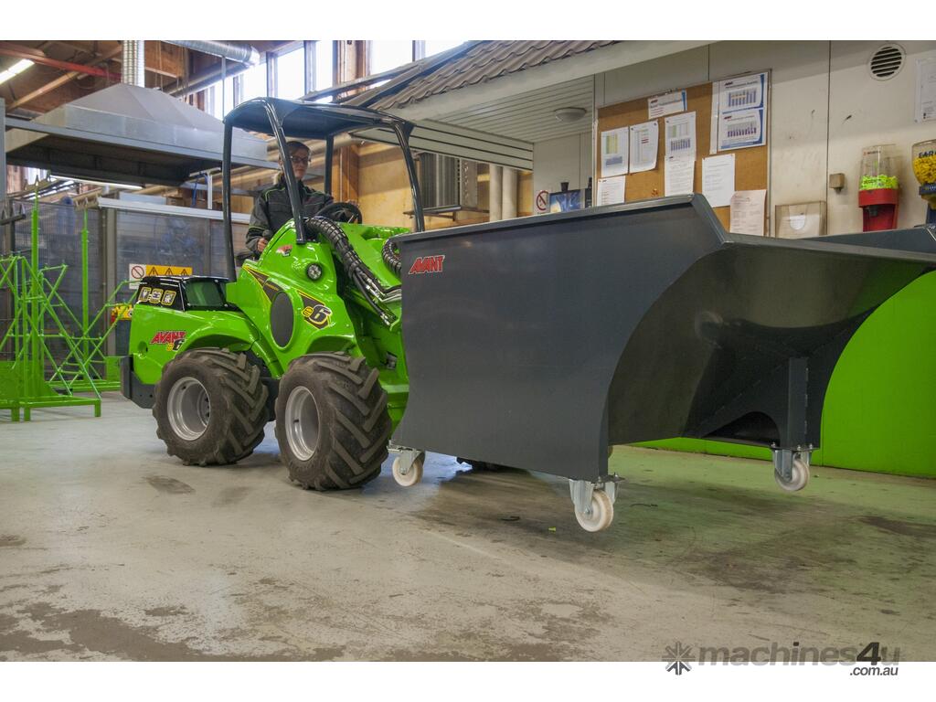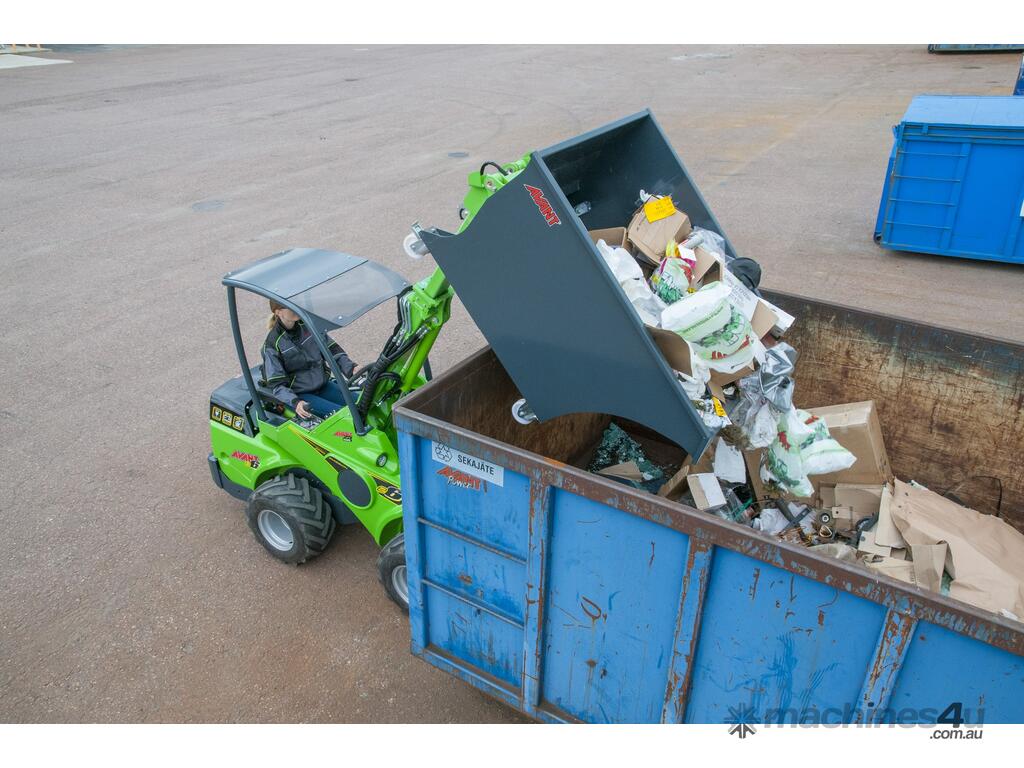 The Avant Skip Bucket attachment is a skip bin that can be transported and emptied easily with an Avant compact articulated mini loader.