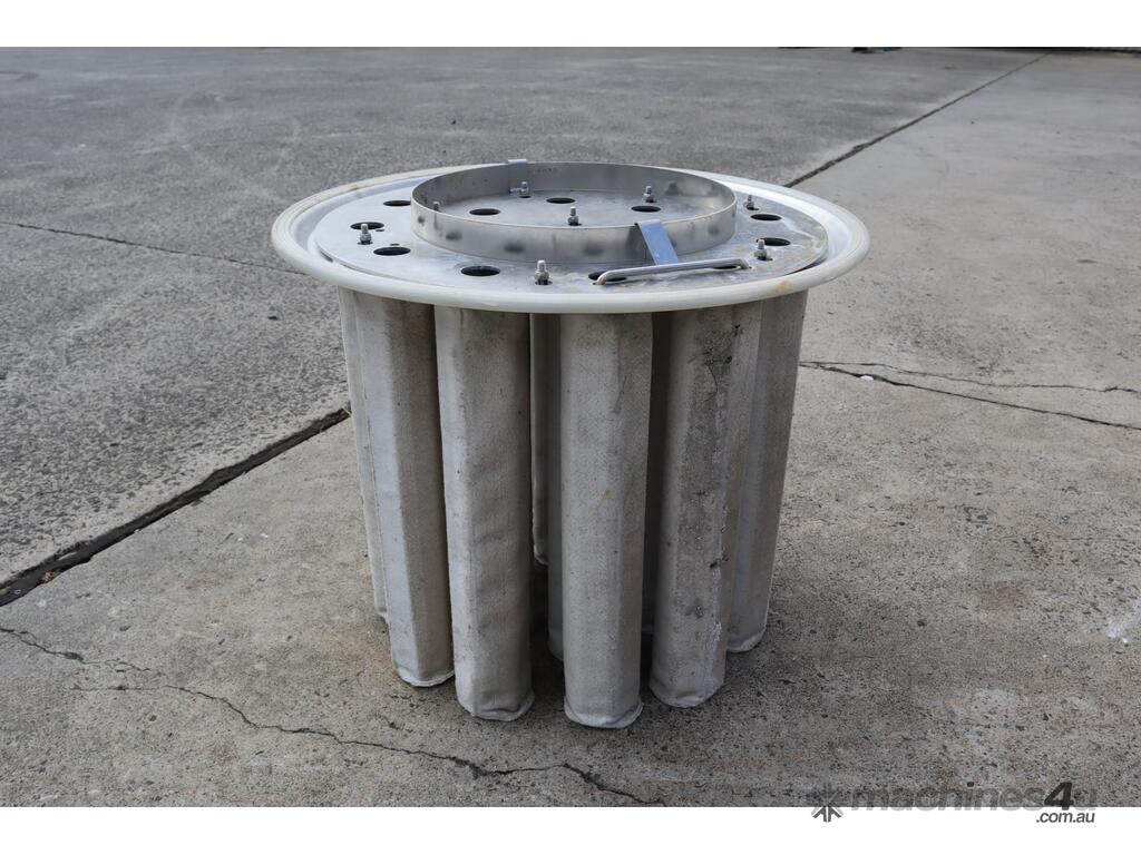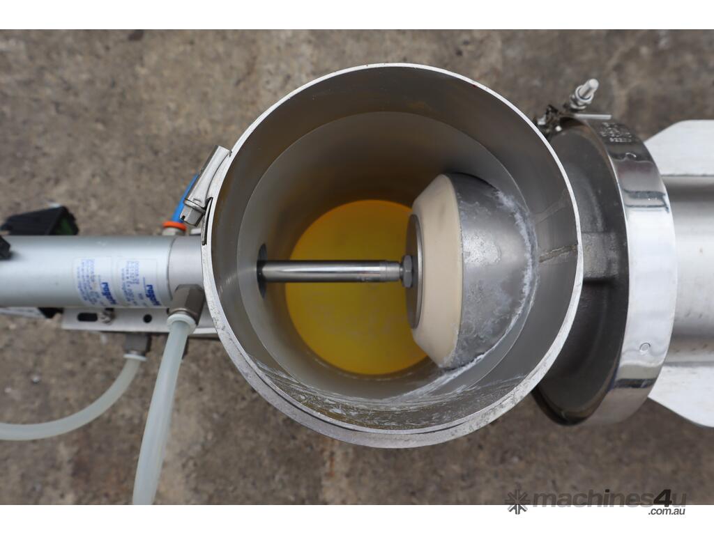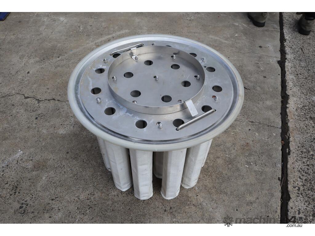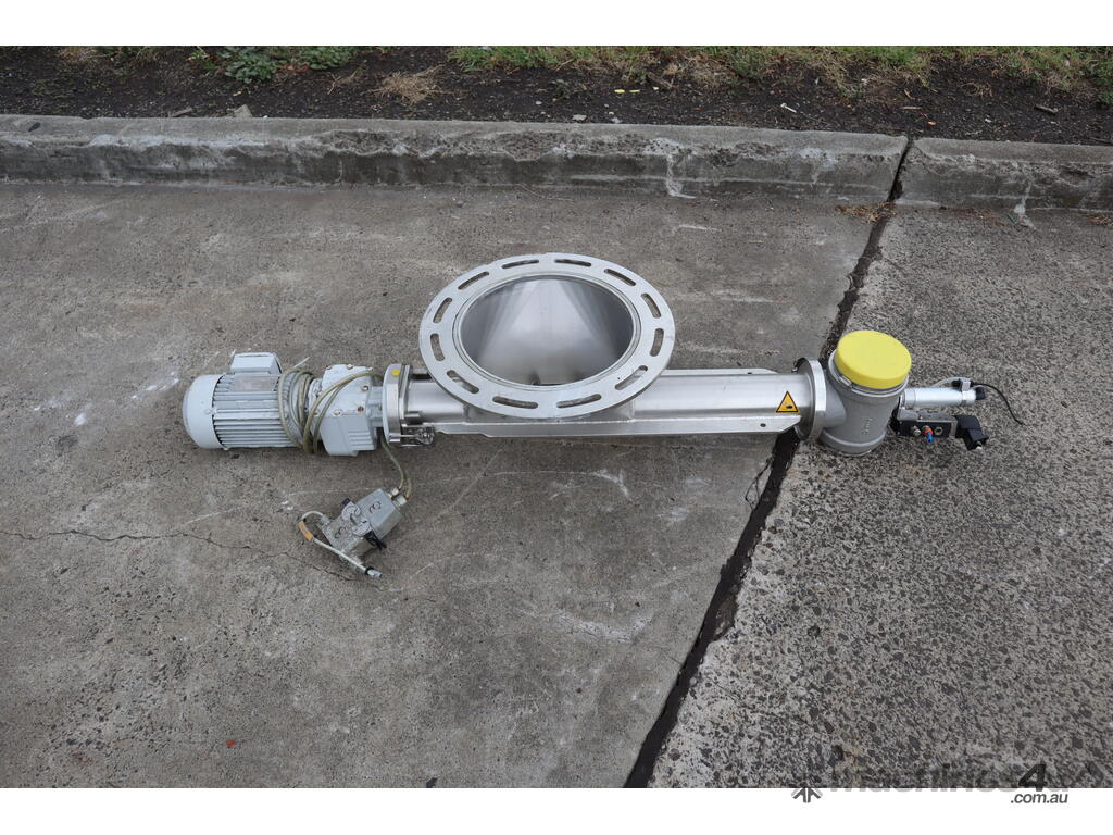 Filter with compressed air cleaning. Outlet with compressed air-operated outlet flap and expansion filter, including delivery and clean air connection and electronic control or connection control for PLC. Fastening to the customer's machine funnel using screws. Parts in contact with the product made of stainless steel, surfaces bright-rolled, weld seams ground.