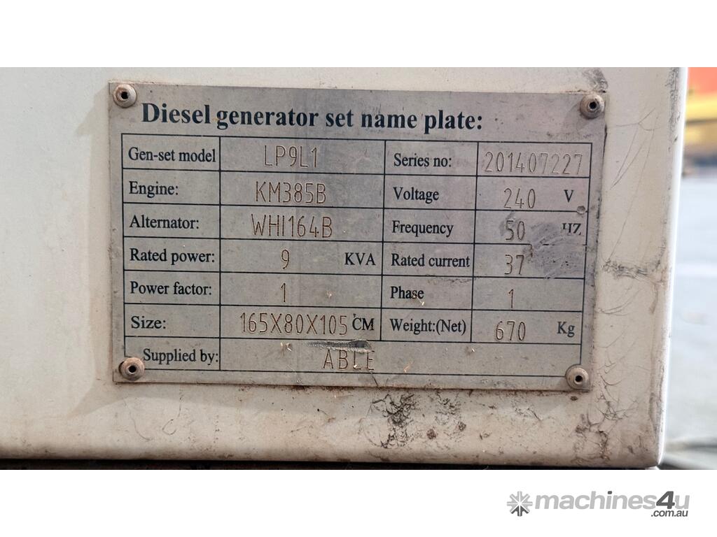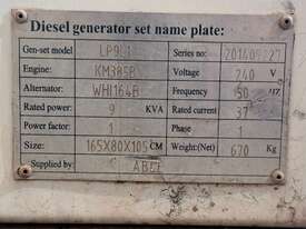 Able LP9L1 9kVA Diesel Generator,Able LP9L1 Diesel Generator, 9 kVA Output, Single Phase, 240V, 50Hz, Serial No: , 1650mmL x 800mmW x 1050mmH, 670 kg Net Weight, 3469 Hours Showing, Last Service 05/05/2023, Started For Inspection,Serial No: