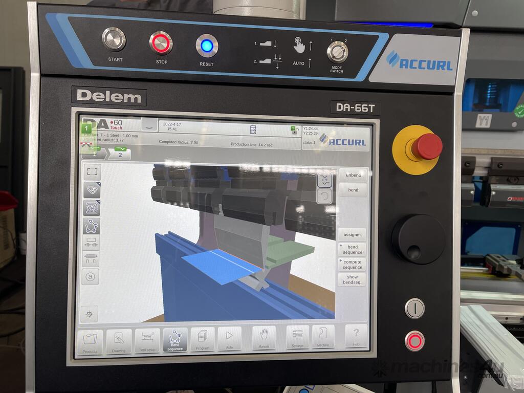 A Delem DA-66S controller is used on this machine for 2D/3D graphical visualization of the program. The machine is equipped as standard with 6 axis (Y1/Y2/X/R/Z1/Z2)
