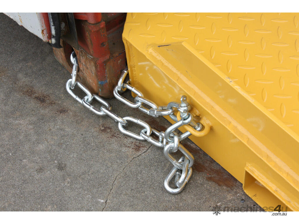 This container ramp has been designed for fast positioning and removal. Fitted with pockets each side, plus flip-up front tine pockets, this ramp can be manoeuvred in confined spaces. Raised side plates ensure the Forklift remains on the ramp. The tread plate decking is fully gusseted underneath to eliminate fatigue. Securing safety chains both sides of the ramp prevent unintentional disengagement of the ramp from the container.