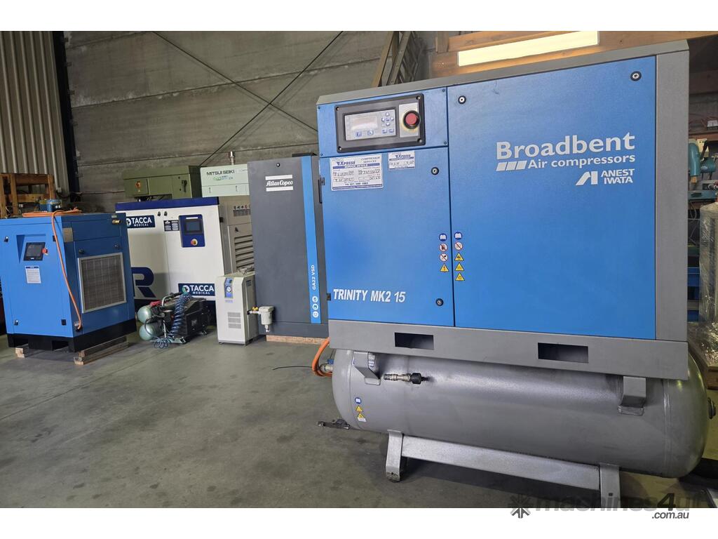 7). BROADBENT (ANEST IWATA) TRINITY MK 15kw 20hp 415v 8 BAR 3-IN-1 FULLY FEATURED ROTARY SCREW COMPRESSOR Year 2019 MADE IN ITALY, INCLUDING BUILT-IN REFRIGERATED AIR DRYER 240v MOUNTED ON 270 LITRE AIR RECEIVER TANK, GENUINE HOURS, VERY COMPACT, HEAVY DUTY, TOP QUALITY. BARGAIN!