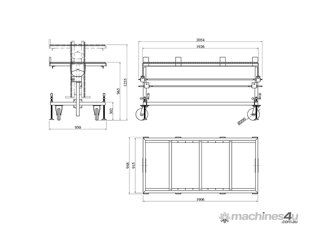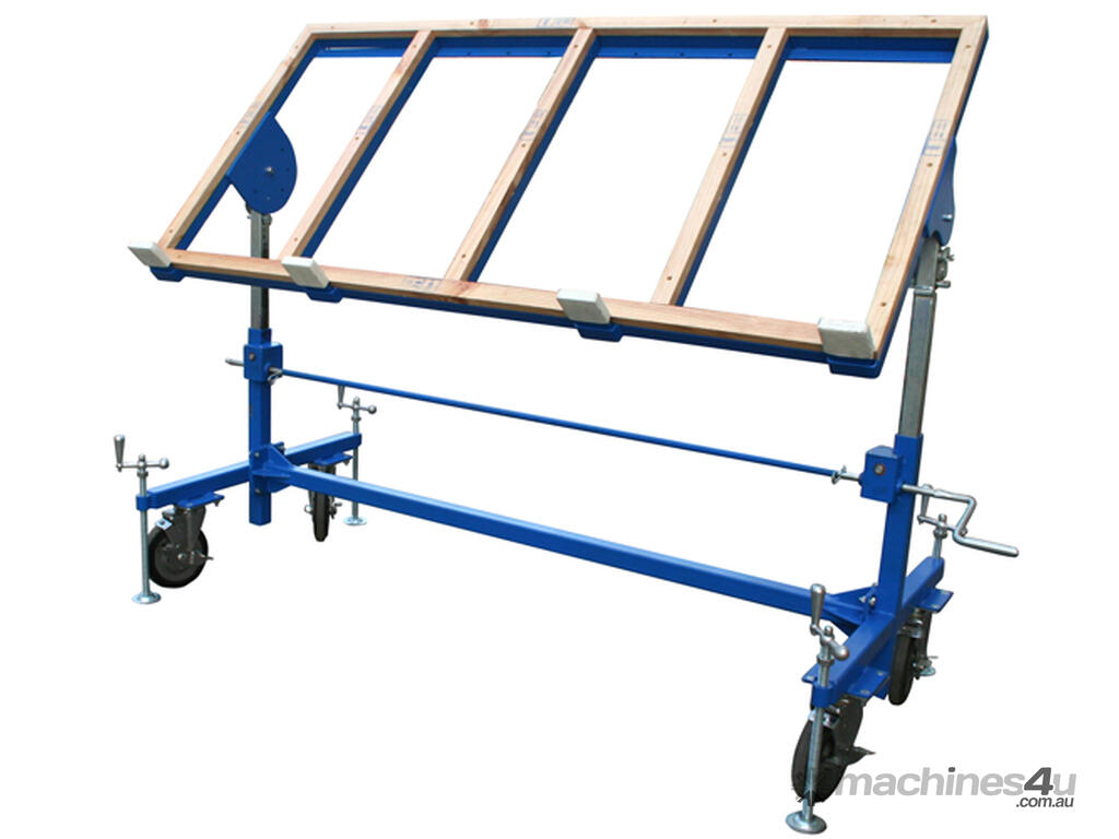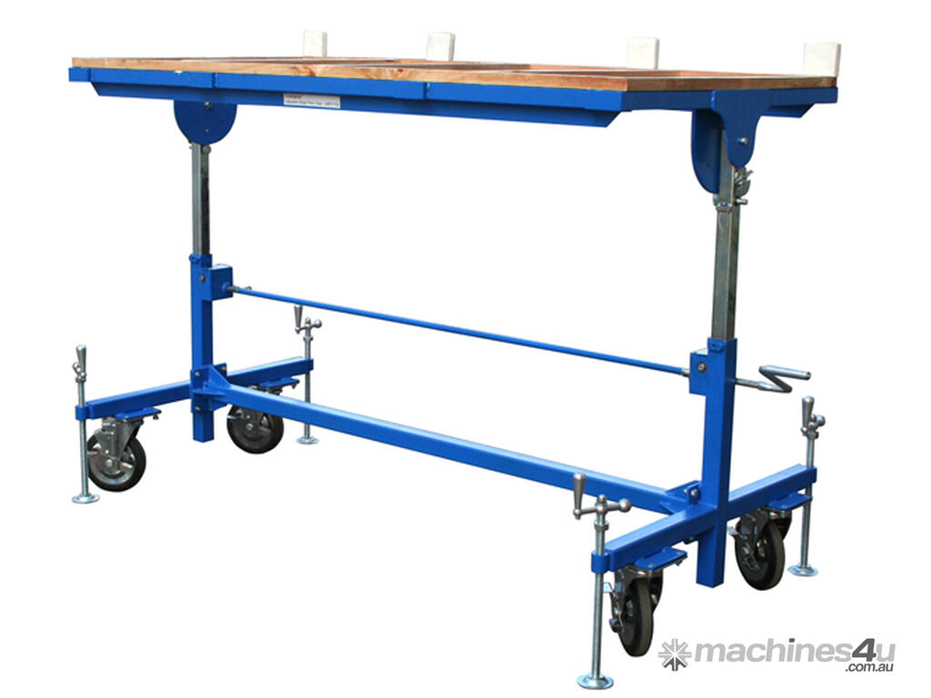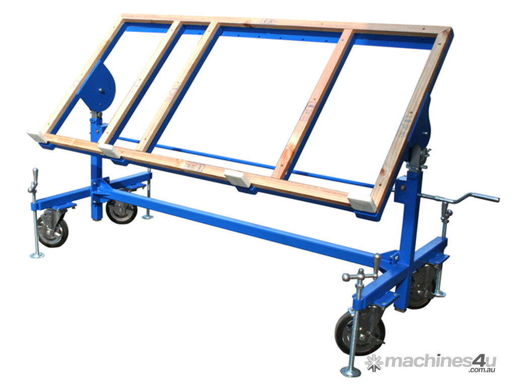 Versatile dual-function fabrication table ideal when cutting, grinding or polishing an already cut-to-size piece. Serves as a work table in the horizontal position, and as a slab dolly in the vertical position. The table top is adjustable for different sloping positions and height adjustable to suit the specific physical needs of the person in order to maintain optimum ergonomic positioning. With four adjustable levelling posts for stability and removable centre braces for convenience when working with sink hole cut-outs.
