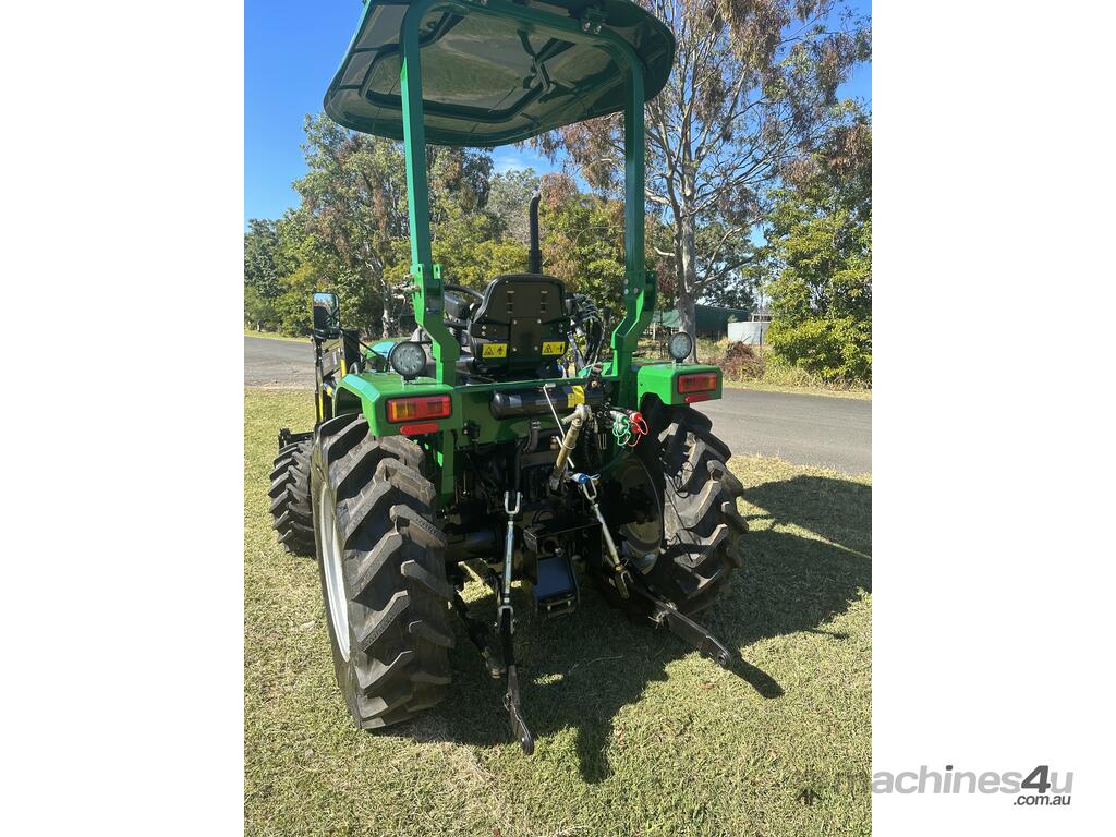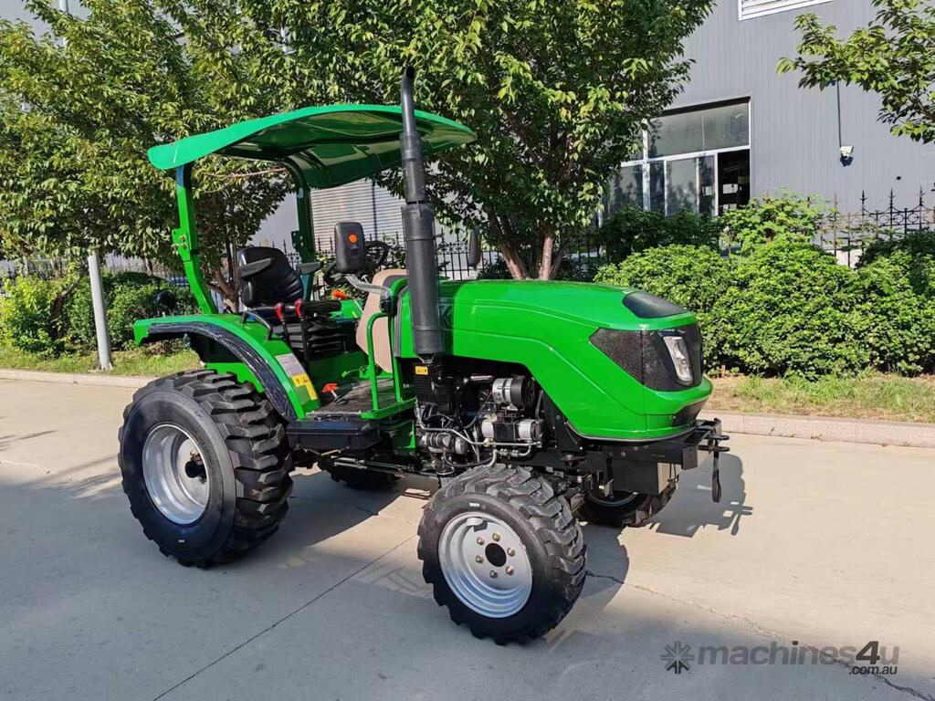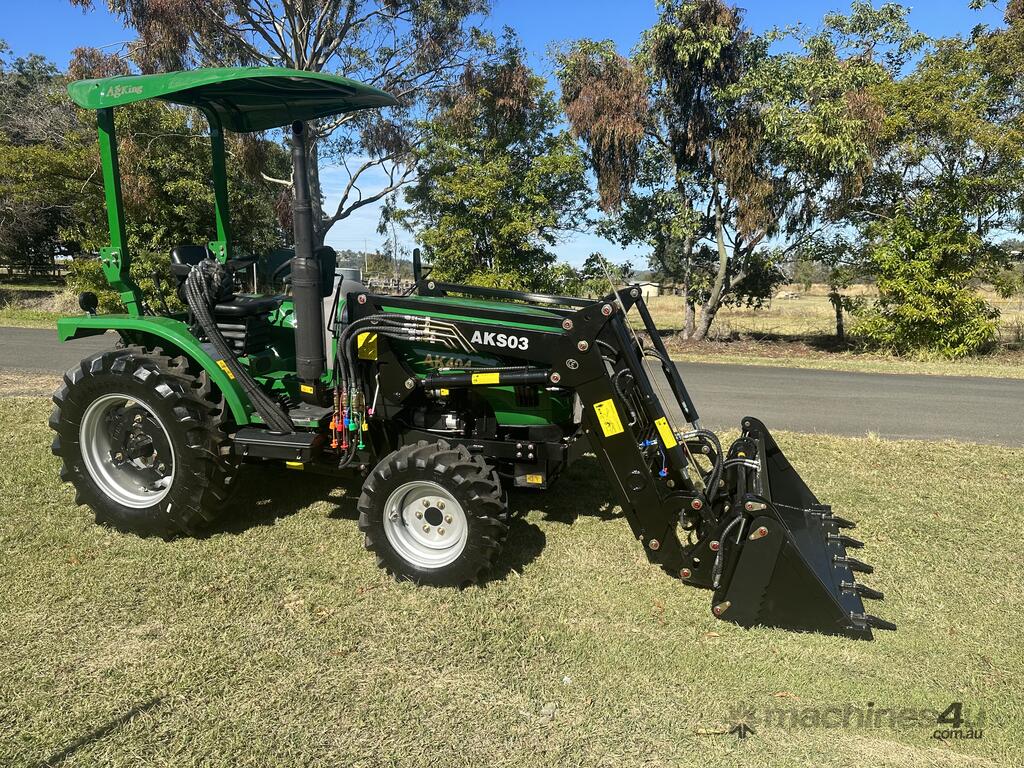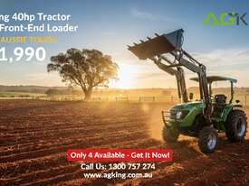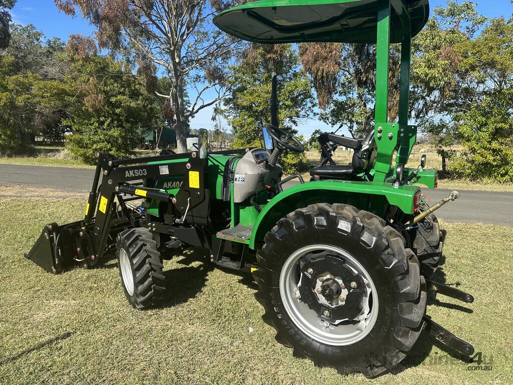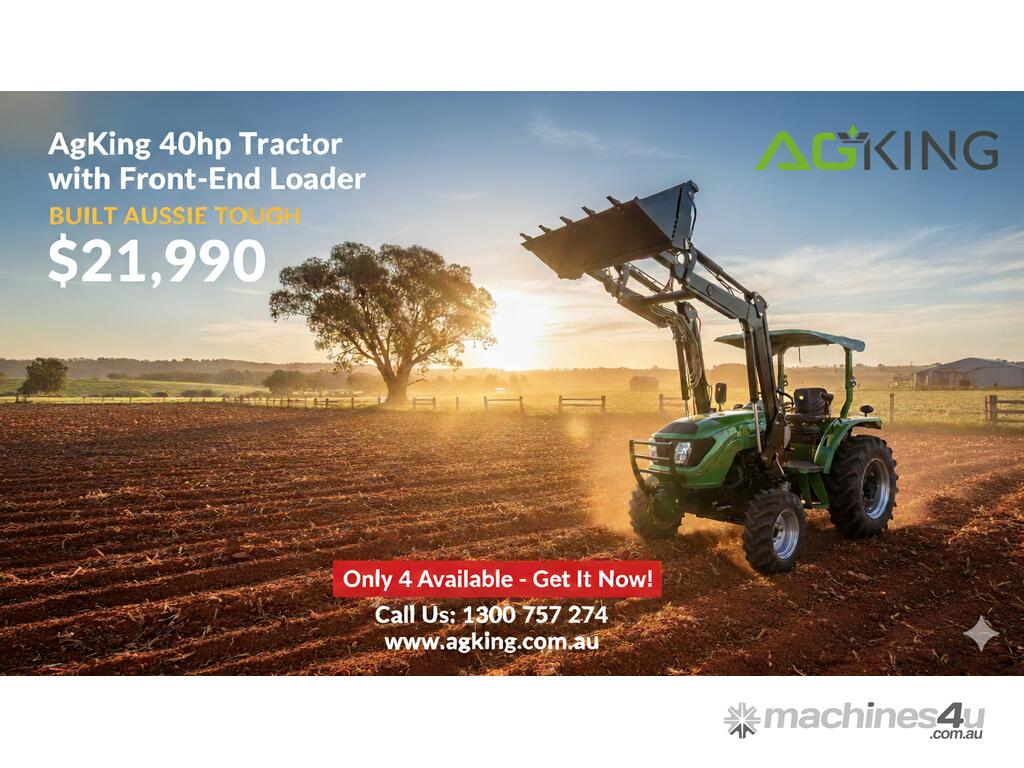 AgKing AK404 40HP tractor with 8 speed gear box, shuttle shift, diff lock, ROPS with wide shade cover, two sets of remote hydraulics, swing draw bar and tool box. Fitted with 4 cylinder diesel engine and Agricultural tyres.