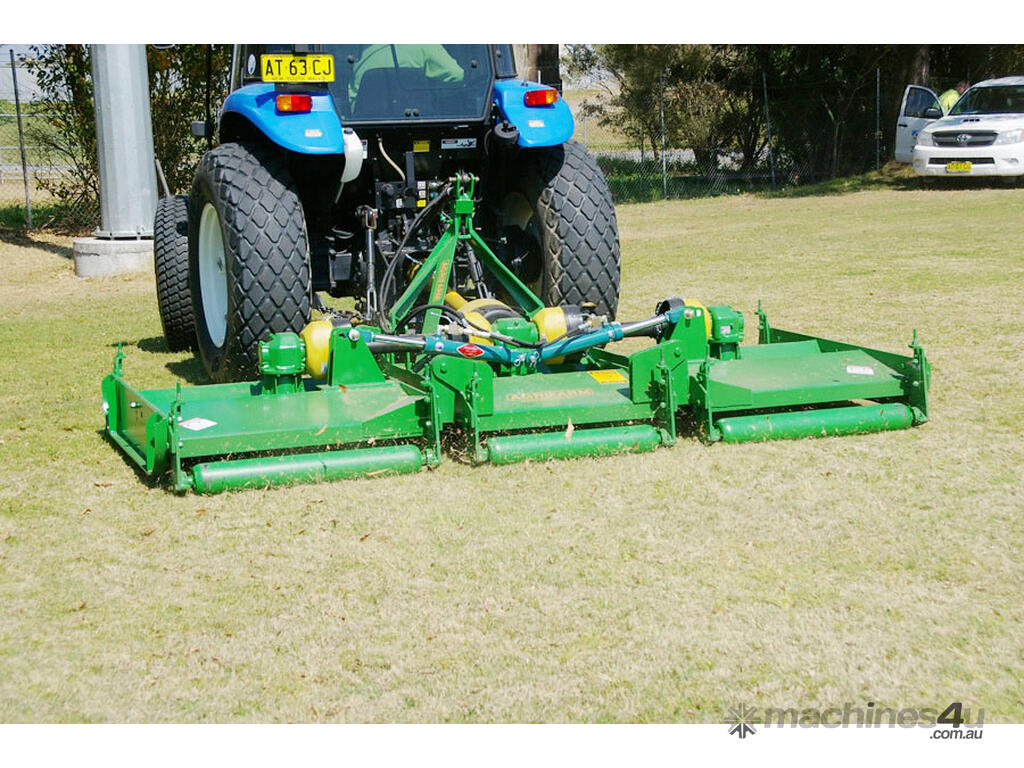 Three body section finishing mower designed to float independently on height rollers and follow the ground contour. Suitable for mowing large areas, i.e. parks, ovals and turf farms.