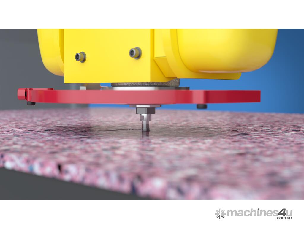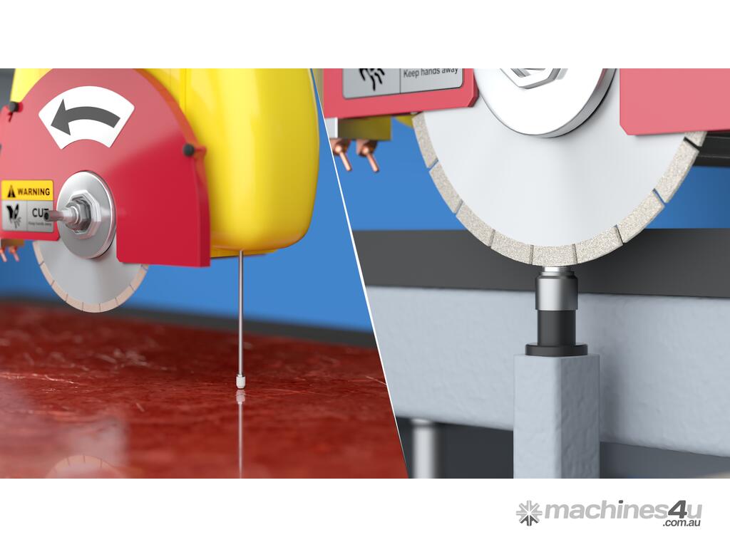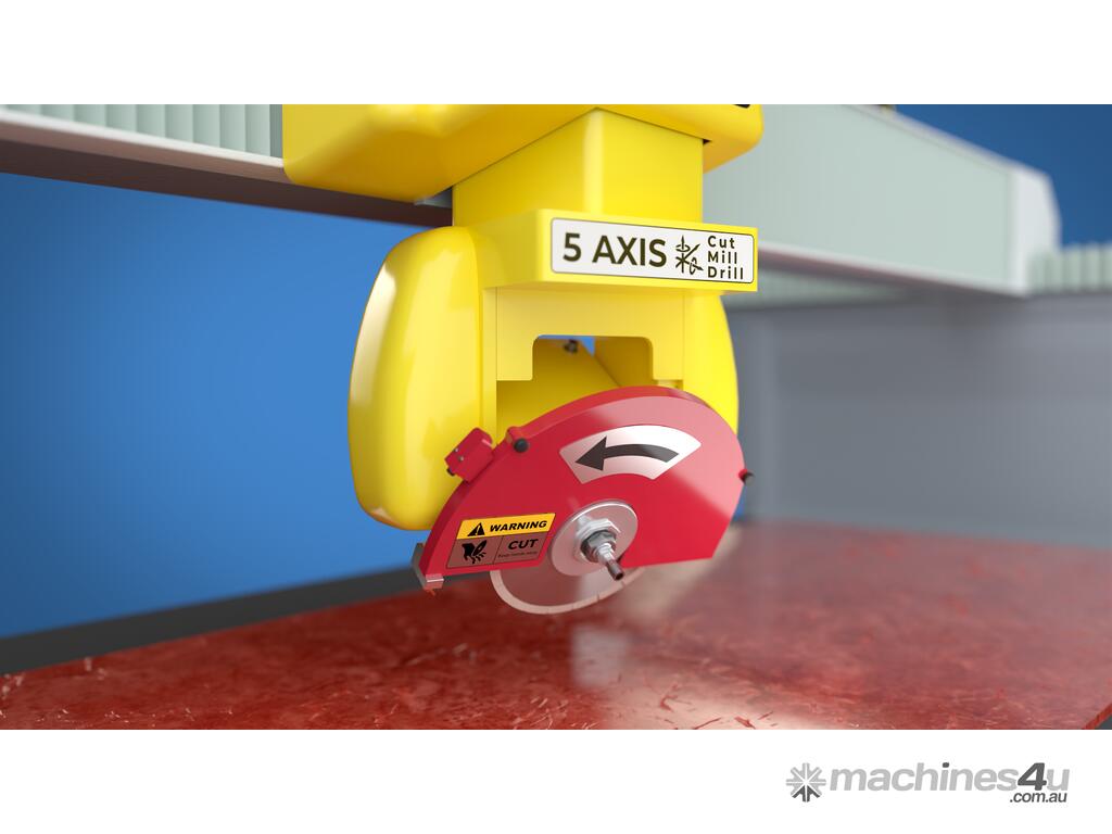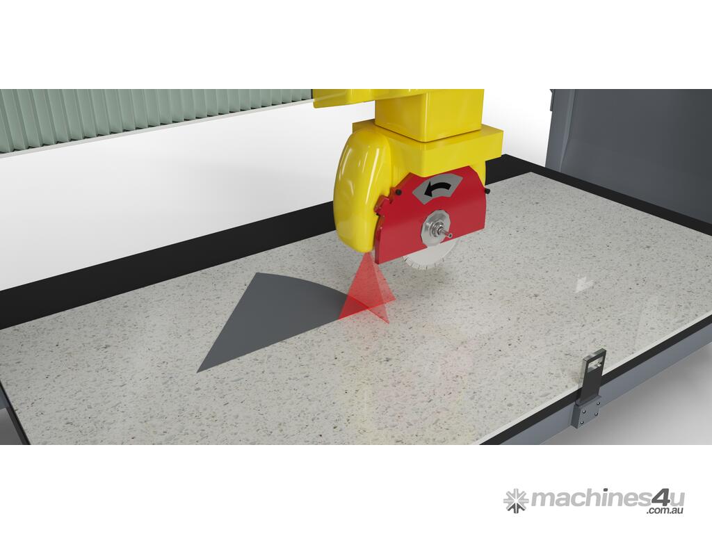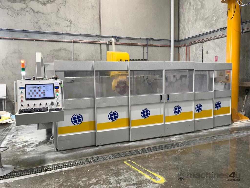 This bridge saw has everything a technologically advanced bridge saw needs to have today. A Monoblock Construction with 5 Interpolated Axis Spindle, Half inch Fitting with Through-Spindle Lubrication, On-Board Camera with DXF Templating and Pick-a-Point tracking, Tilting Table (up to 85°) for loading delicate slabs onto the machine and an Infra-red Safety Barrier Safety System and Wireless Remote Control.