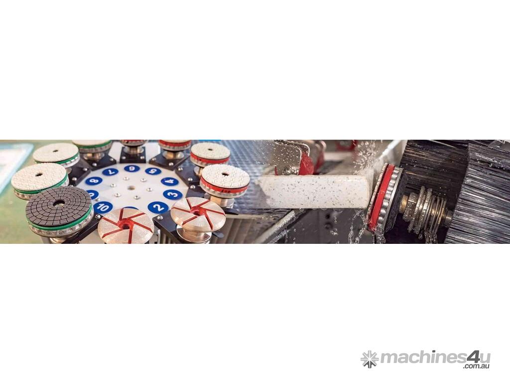 Edge Polisher Robot EPR3500 is an edge shaper and polisher for flat and convex edges of marble, granite, and synthetic/recon stones. The EPR3500 is a fine combination of mechanical, electrical and software engineering. It can shape and polish convex edges on the stone using flat polishing tools. The machine has the fastest patented automatic tool change in the market and has a patented motor that can retract and extend the shaft pneumatically to apply different pressures, adjusting the workload of each tools on the stone. Programmable to any angle and position on the stone edge to achieve incredible quality results.
