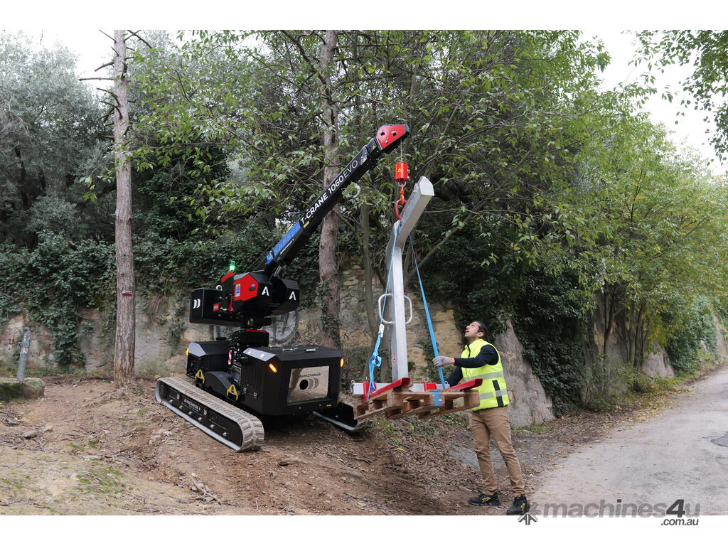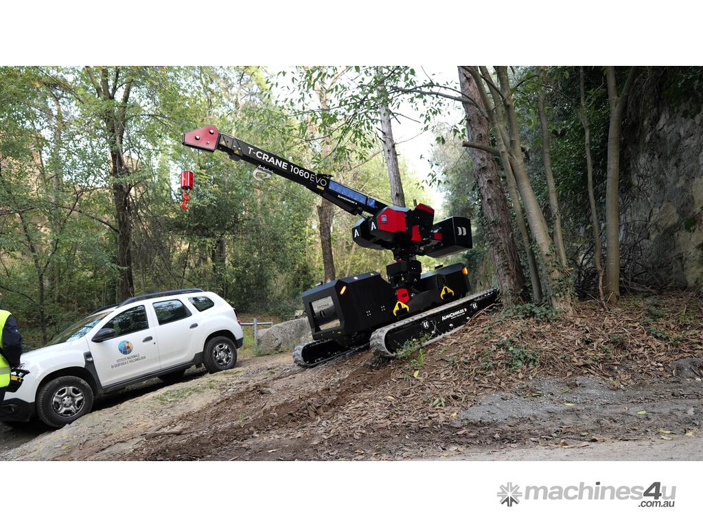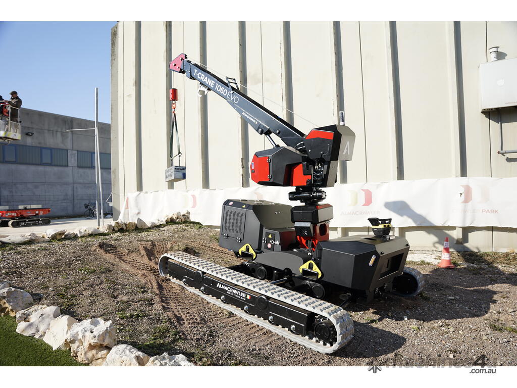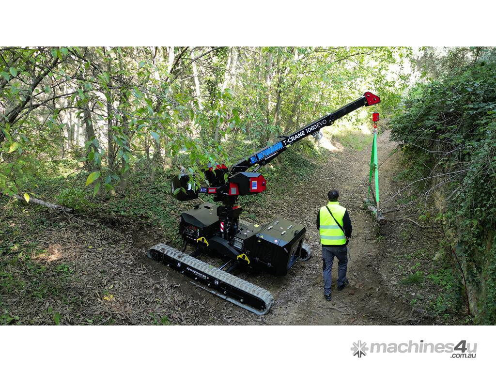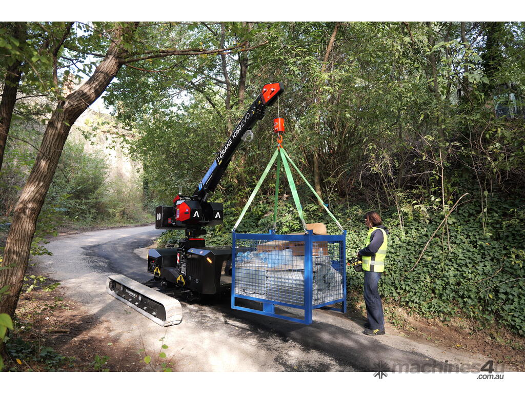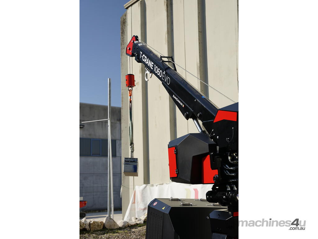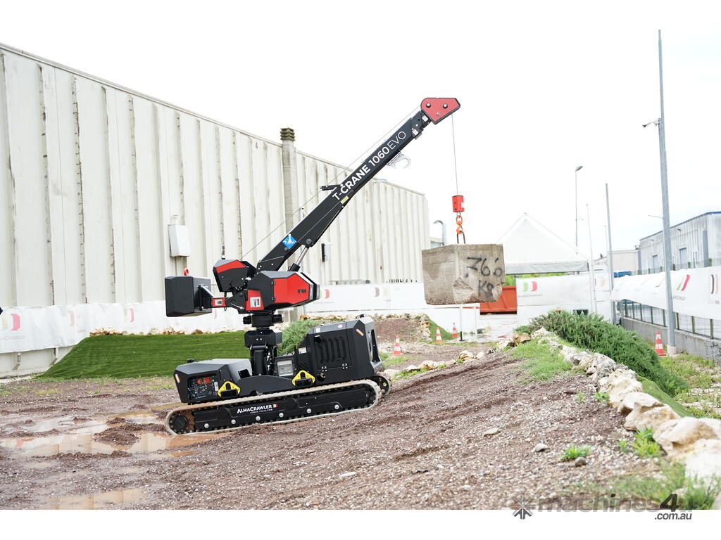 Equipped with a standard remote control, the T-Crane 1060 easily travels and carries loads up to 990kg, featuring a 7.7m lifting height with a 6.1m maximum working radius.