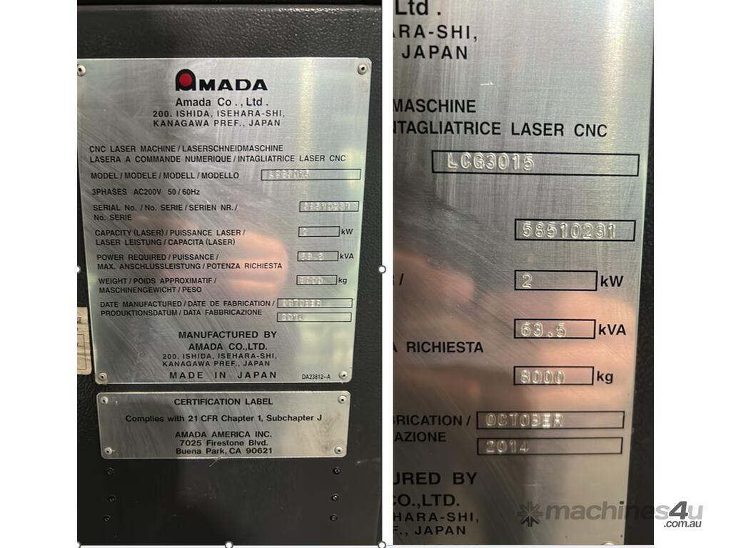 The laser is an Amada LCG3105 C02 2.5Kw laser with a twin pallet changer. It has always been maintained by Amada, in the last year the Turbo blower and the Invertor power supply units have been changed.