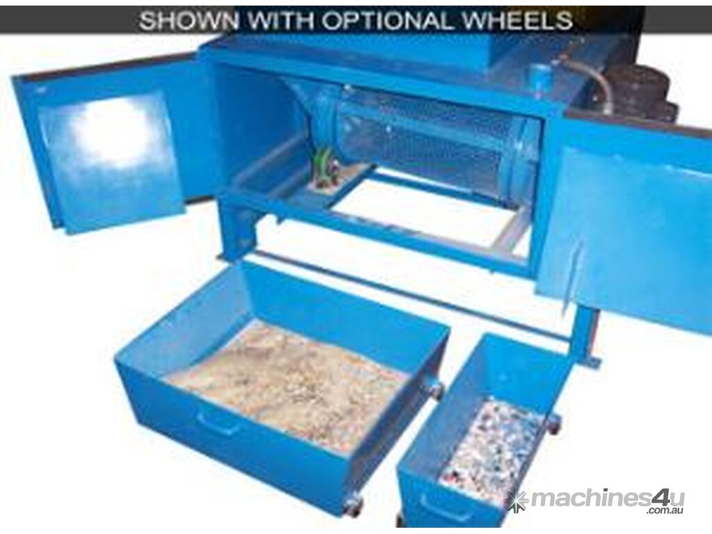 Glass bottles, up to 8" in diameter, are placed by hand on the infeed conveyor and carried into the pulverizer. The pulverized glass goes into the screen to remove the residue (caps, corks and labels). The glass drops into a bin mounted on casters for easy removal from underneath the unit. The residue is separated and deposited into its own, smaller bin under the unit. A dust removal port is provided for a small dust collector that can be attached to alleviate any nuisance dust produced by the process.