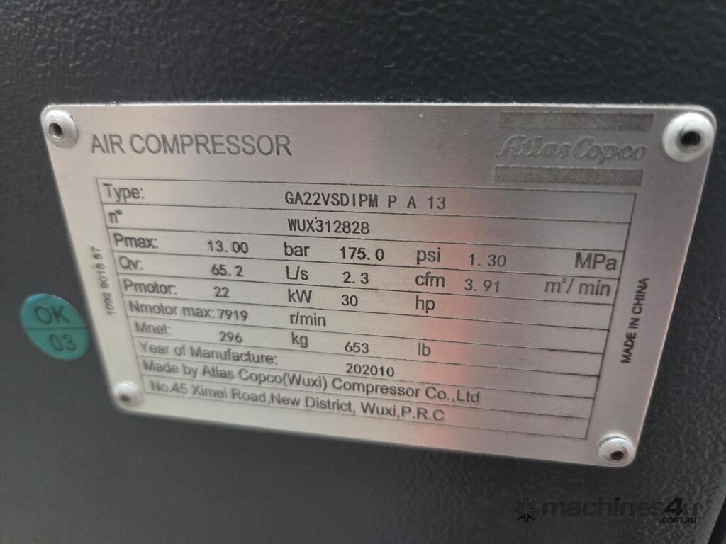 4). ATLAS COPCO GA22 VSD 22kw 30hp 415v 8-13 BAR 138CFM VARIABLE SPEED ROTARY SCREW COMPRESSOR BASE MOUNT Year 10/2020, GENUINE LOW 5,500 RUN HOURS (TBC), REGULARLY SERVICED INCLUDING RECENT OIL SEPARATOR REPLACEMENT. HUGE PRICE REDUCTION! TESTED SHOWING OIL LEAK FROM DIRECT DRIVE ELECTRIC MOTOR, REPAIRABLE.