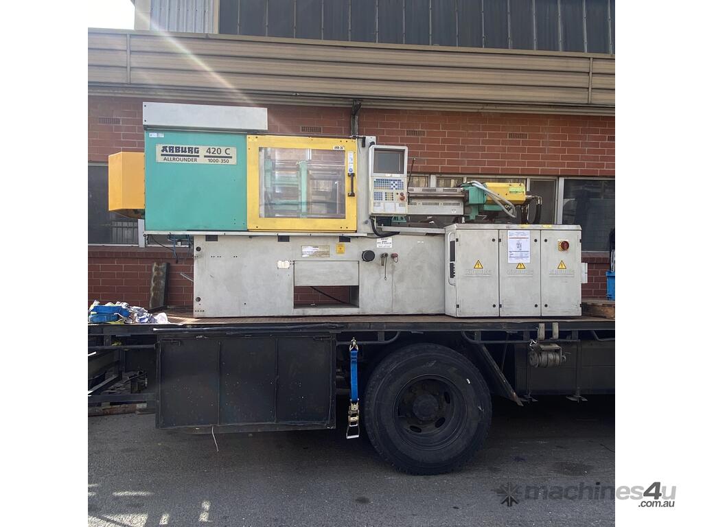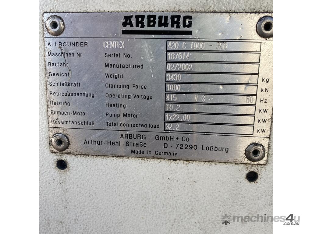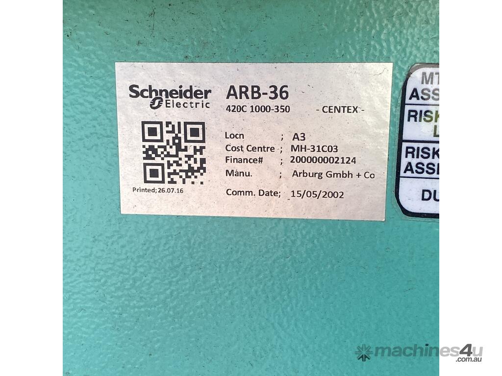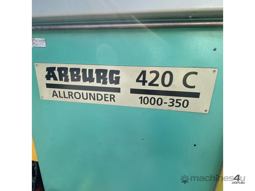 Arburg 420C Allrounder 1000-350 Injection Moulding Machine, Commission Date 15/05 2002, rated 100 Tonne, tie bar spacing horizontal 420mm, spacing vertical 420mm, mould height minimum 250mm, max height 750mm, opening stroke 500mm, screw diameter 35mm, control panel, Emergency stop button, sliding doors, 3 phase power,