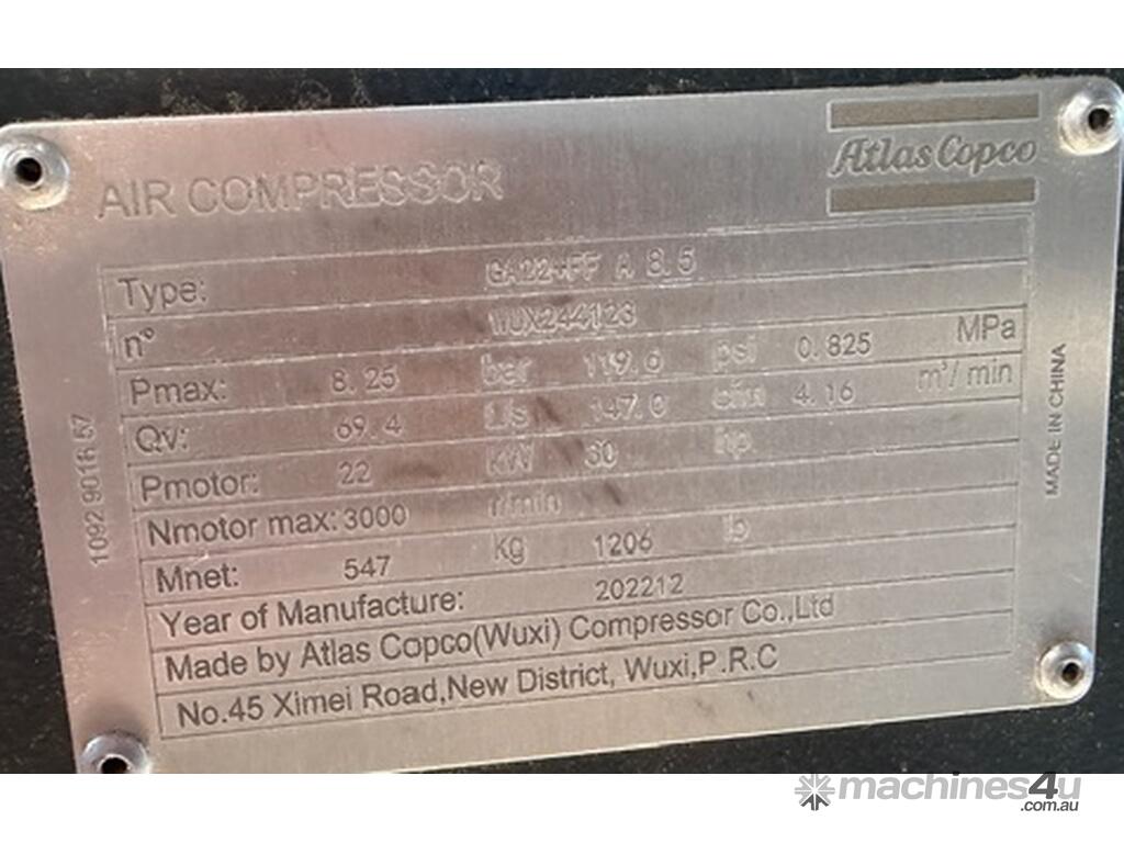 2022 Atlas Copco GA22+ FF air compressor in almost brand new condition with only 3318 hours.