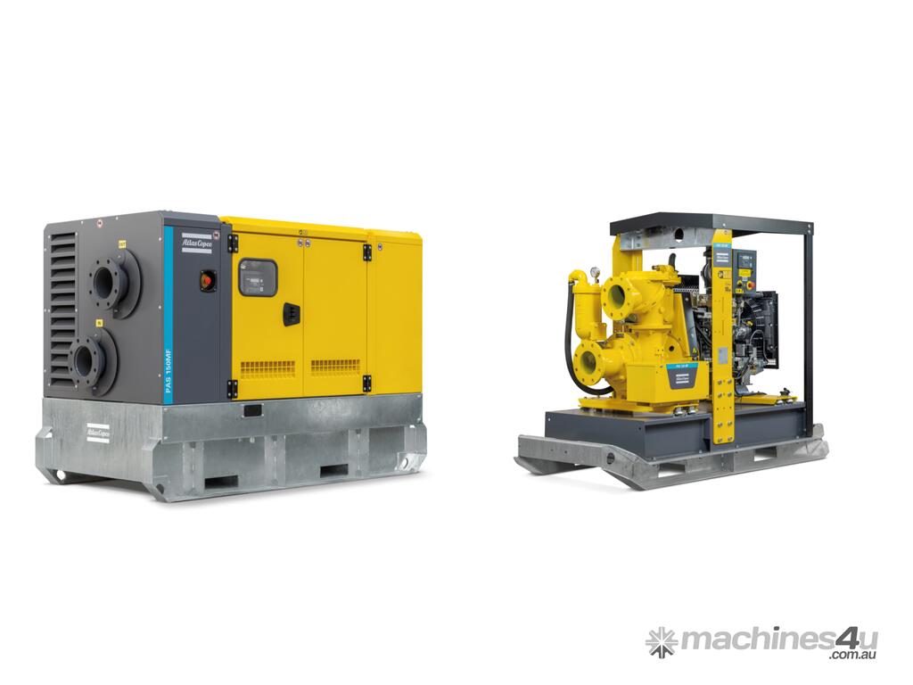 Available as a Canopy or open set - the PAS100MF pumping system consists of a centrifugal pump and a separator, which enables air to be separated from the liquid and be sucked by a vacuum pump - making automatic priming possible. Even with suction heights of several meters the machine rapidly evacuates the air from the suction pipe and starts to pump. Additionally, thanks to the semi-open impeller, the PAS HF range is also suitable for pumping liquids with solids in suspension. For more information - please refer to the attached Atlas Copco PDF brochure