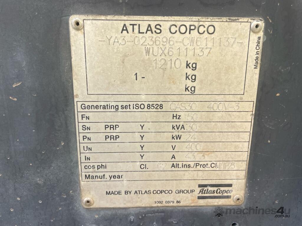 Atlas Copco QAS30 Generator,ATLAS COPCO Model: OAS30 400V-3, YEAR: 2012, Note: Used , Untested, Maybe Incomplete.,Serial No: YA3-023696-CW611137-WUX611137