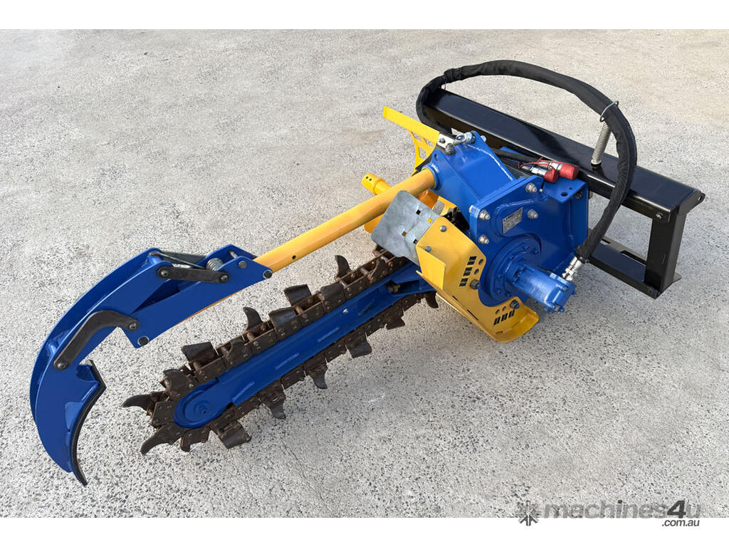 Auger Torque MT900 trencher with crumber bar for skid steers – excellent near new condition – flat-face couplers (can exchange for poppet couplers on request) – combination chain (tungsten rock and earth teeth) – 150mm cutting width – max cutting depth 900mm.