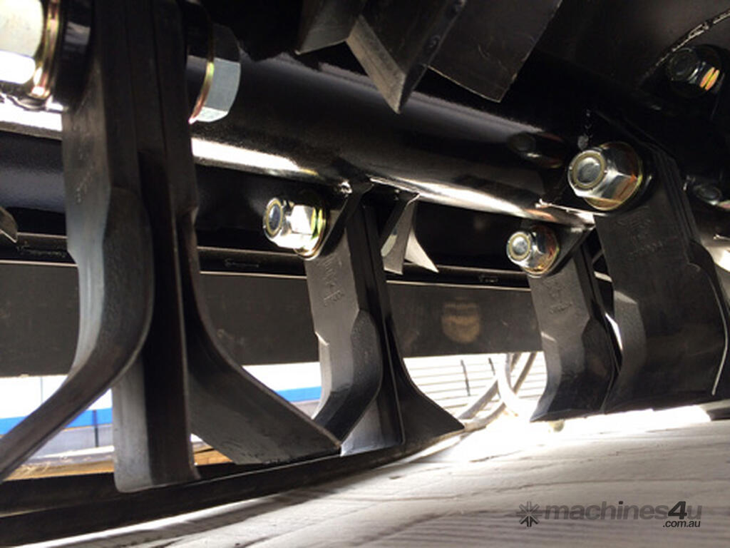 The heavy duty frame supports a 1250mm wide swinging flail cutter drum. There are three flails, two Y Blades and a single hammer or flat blade attached to each mounting lug on the cutter drum. This combination has proven to be the most versatile, enabling a relatively fine cut for general pruning, brush and grass cutting, while also having the ability to mulch much larger branches up to 125mm.