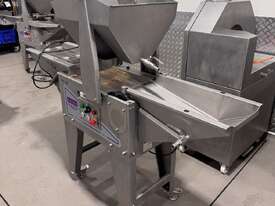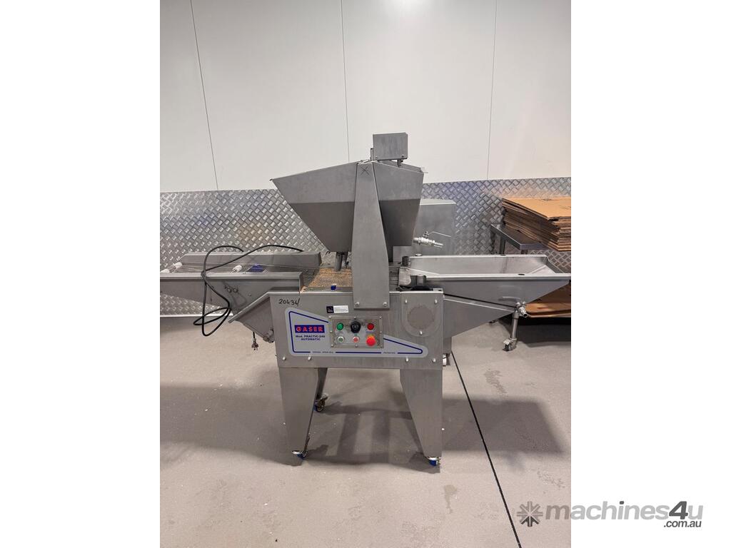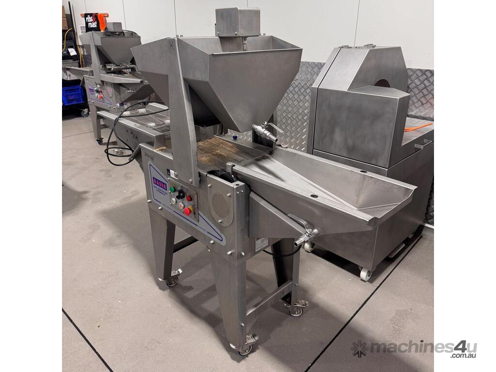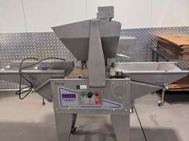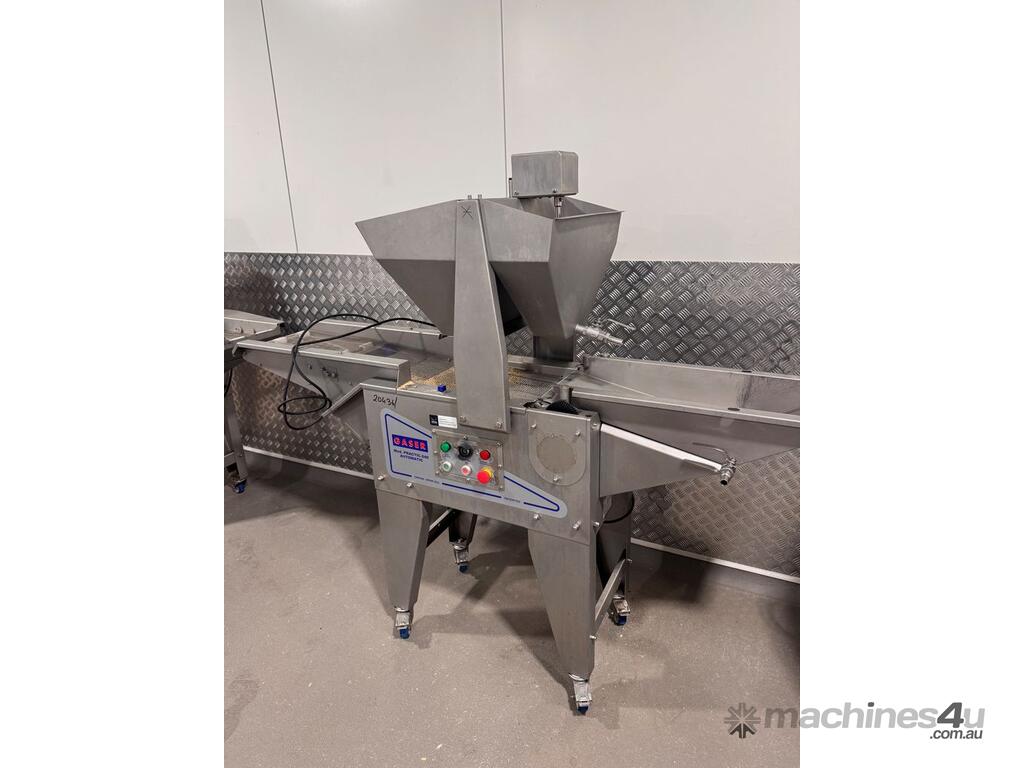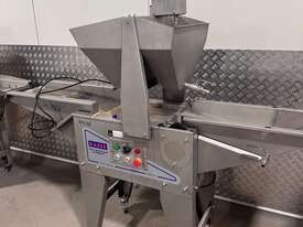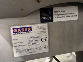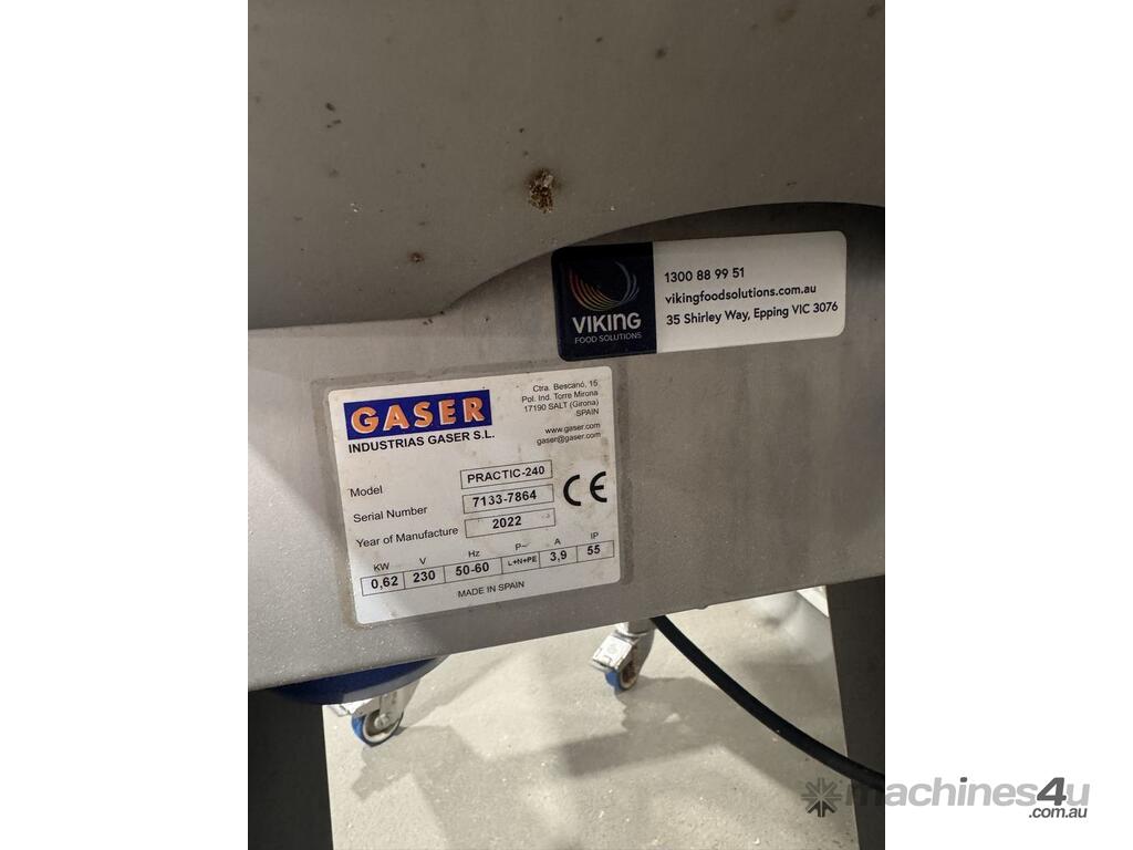 Automatic Batter - Breading Machine, "GASER" Model PRACTIC-240, capacity 3,000 to 4,000 pieces per hour, dimensions 250mm wide x 2000mm long conveyor, stainless steel construction, single phase, mobile