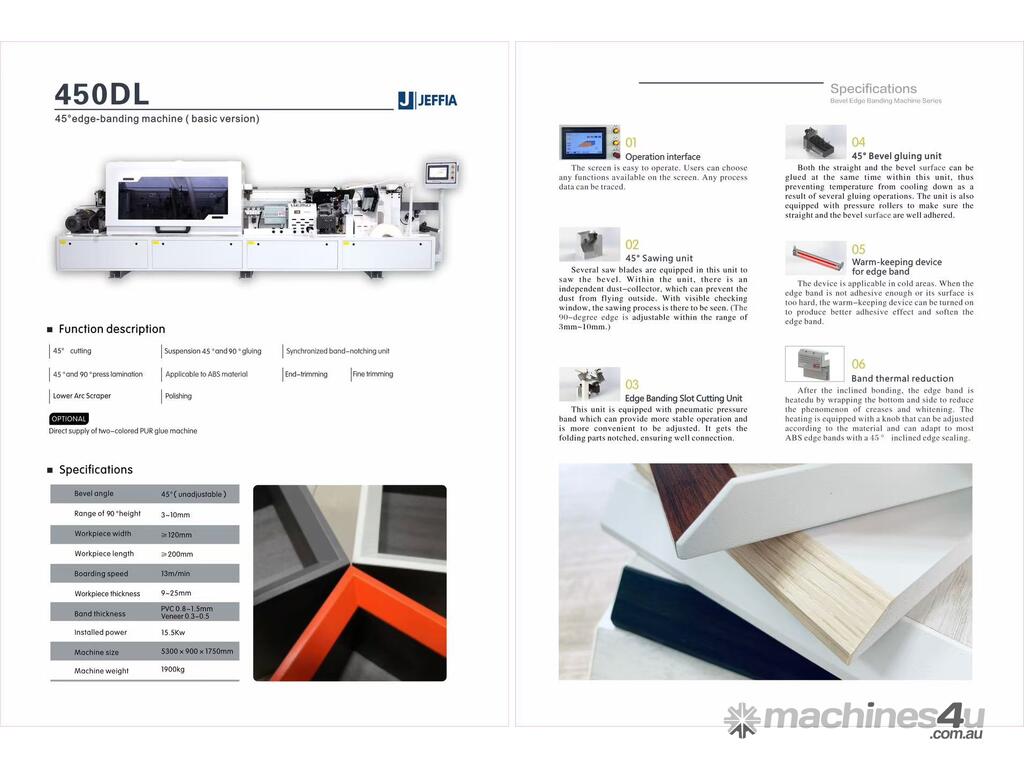 The Jeffia 450DL is a professional industrial edge banding machine designed for high-quality 45° bevel edge and straight edge banding. It is suitable for cabinet makers and furniture manufacturers looking for precise, clean and efficient edge finishing.