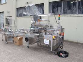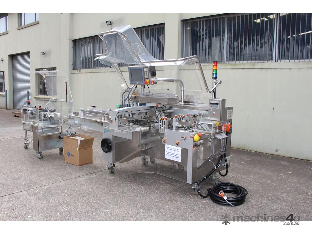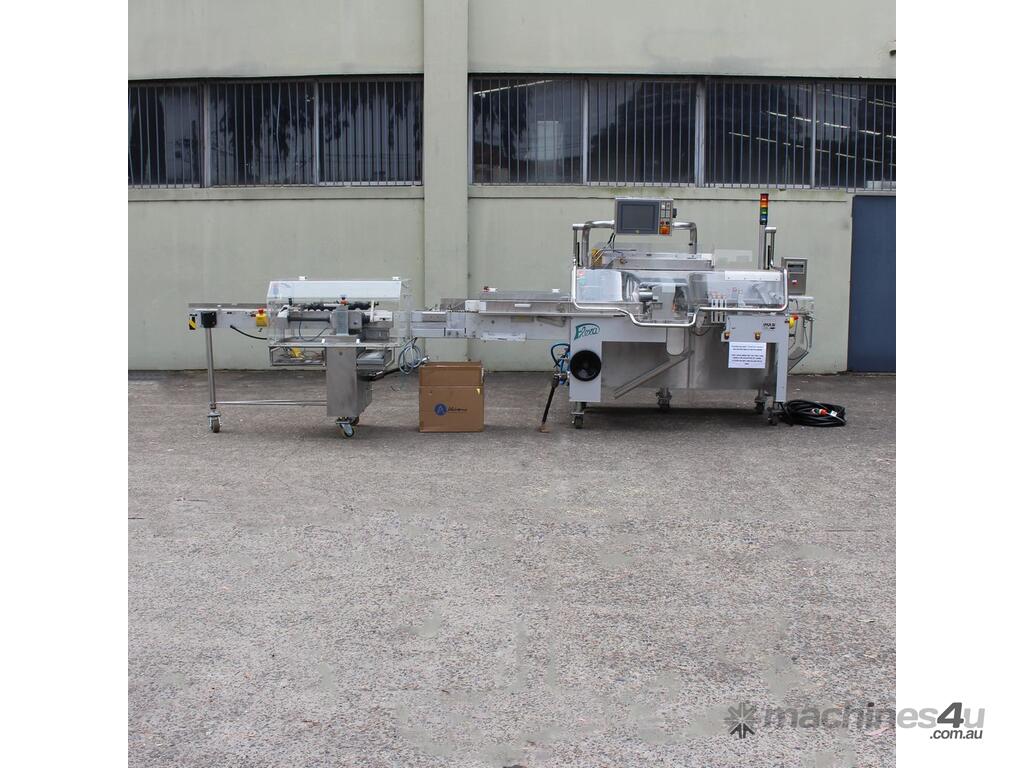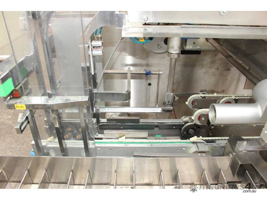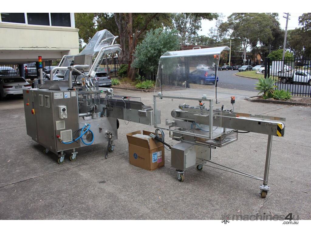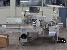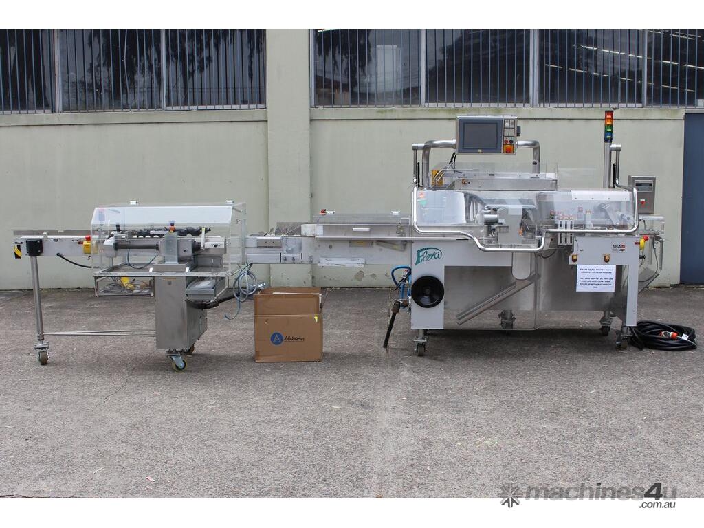 Bottle Cartoner, "IMA" model FLEXA CSD, automatic horizontal cartoning machine with 170mm wide belt and adjustable carton sizing, carton size range 48mm to 80mm width and 89mm to 140mm length, suitable for product sizes 45mm to 78mm width and 85.5mm to 136mm length, complete with infeed conveyor for laying down bottles, supplied with control system, 3 phase 415V power supply, mobile unit, overall dimensions approx. 4500mm long x 1800mm deep x 2000mm high, suitable for pharmaceutical, nutraceutical and cosmetic packaging applications