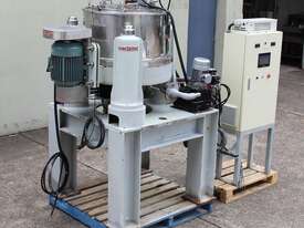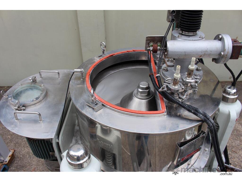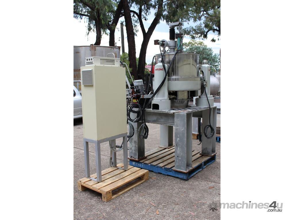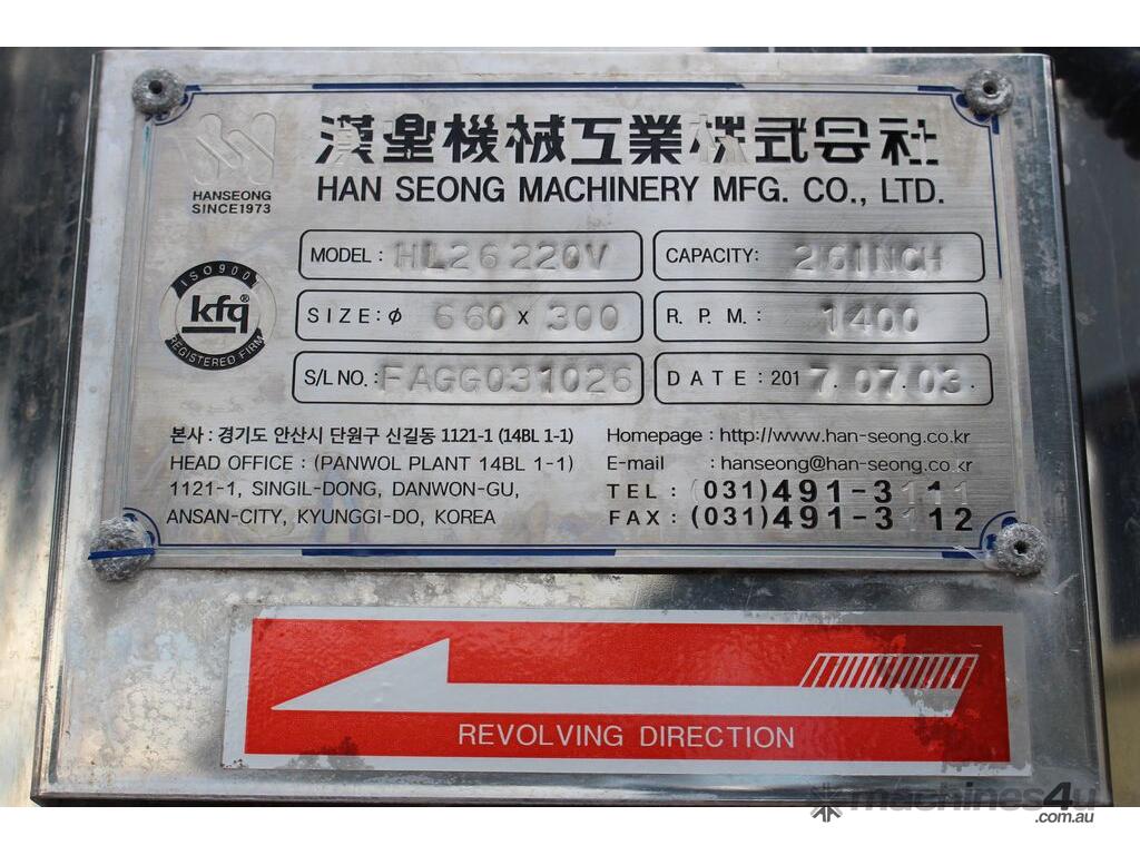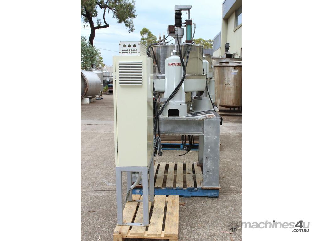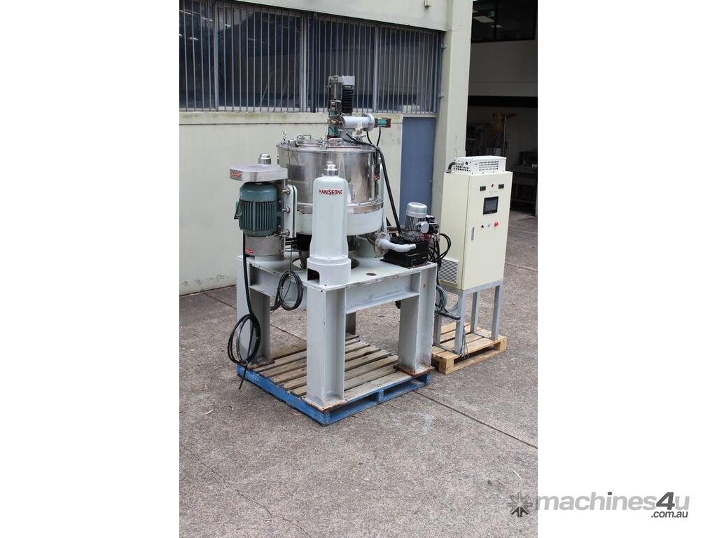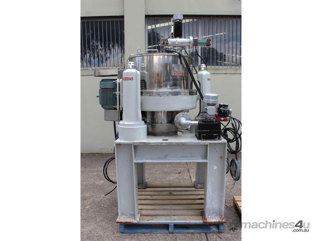 Automatic Scraper Centrifuge, "HANSEONG" Model HL26, capacity 100L, basket dimension: 660mm dia x 300mm deep, speed 2000 rpm, driven by 3 phase 7.5kw motor, hydraulic auto scraper with powerpack overall dimension: 1550mm (L) x 1150mm (W) x 2400mm (H), made in Korea