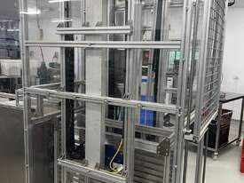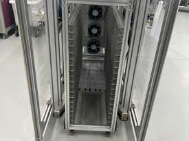 The stacking trolley feeds from the automatic moulding line. This machine is bespoke and was made in Brisbane by a local manufacturing business in 2020 (GAP Engineering). It is designed to take the moulds to limit how many staff are required to man the moulding line. It blows air on the chocolate to cool it down.