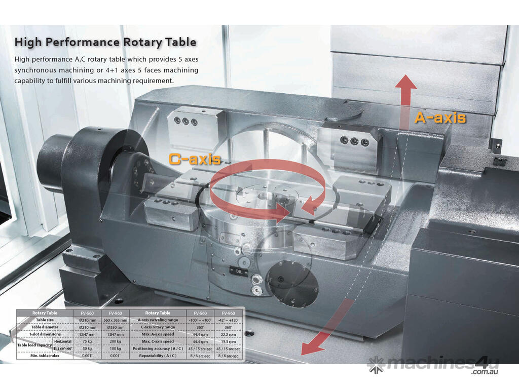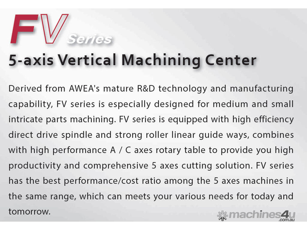 From Awea, the No 1 DMC manufacturer in Taiwan, the FV series is especially designed for medium and small 4+1 and 5 axes intricate parts machining. The FV series is equipped with high efficiency direct drive spindle and strong roller linear guide ways, combined with high performance A / C axes rotary table to provide you with high productivity and a comprehensive 5 axes cutting solution. FV series has the best performance / cost ratio among the 5 axes machines in the same range and can all meets your business’s needs for today and tomorrow. Looking for value without sacrificing quality? Look no further !!!