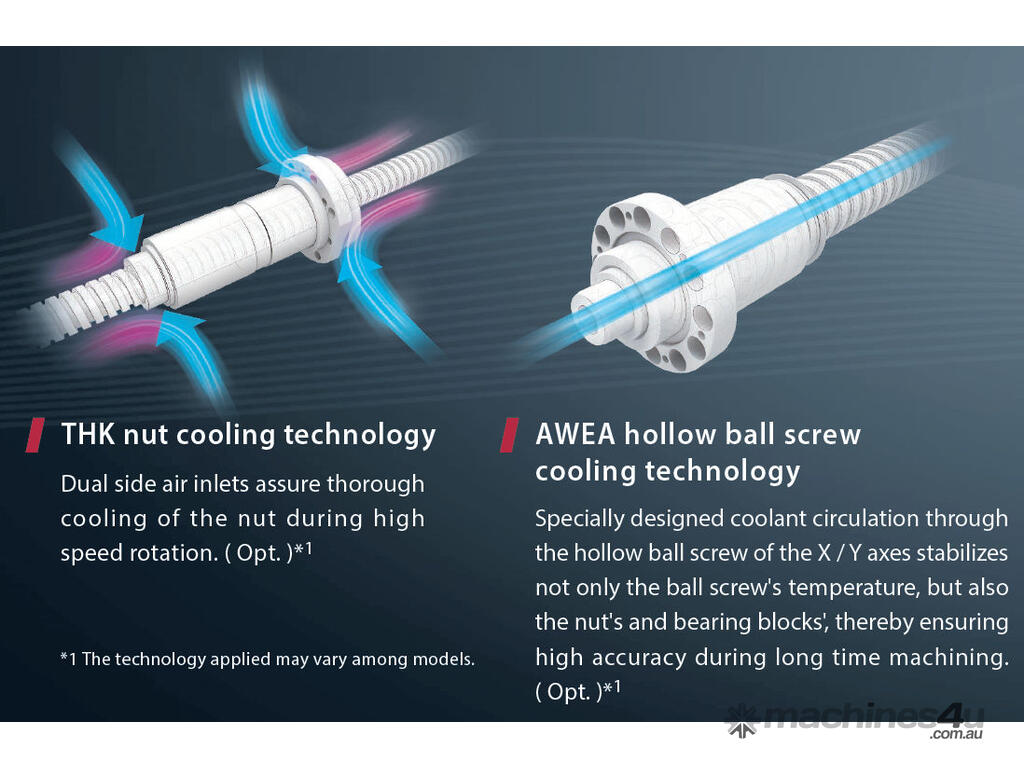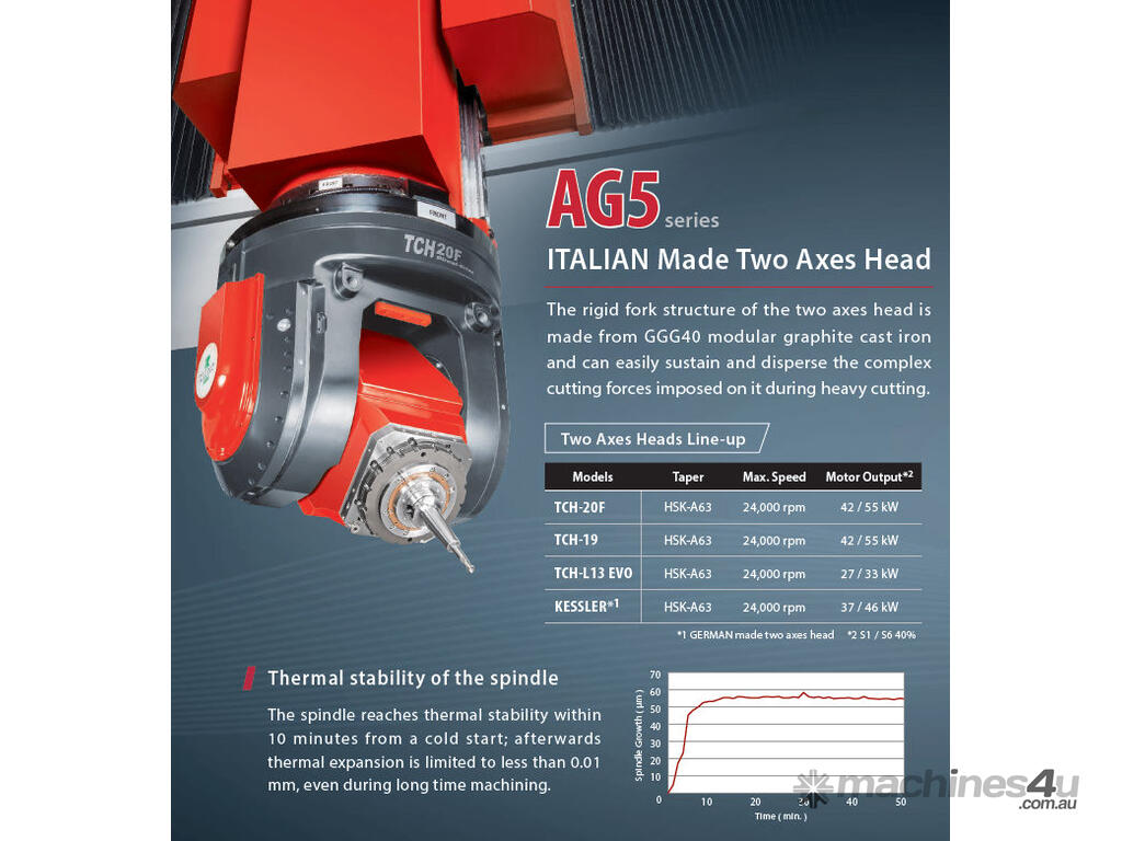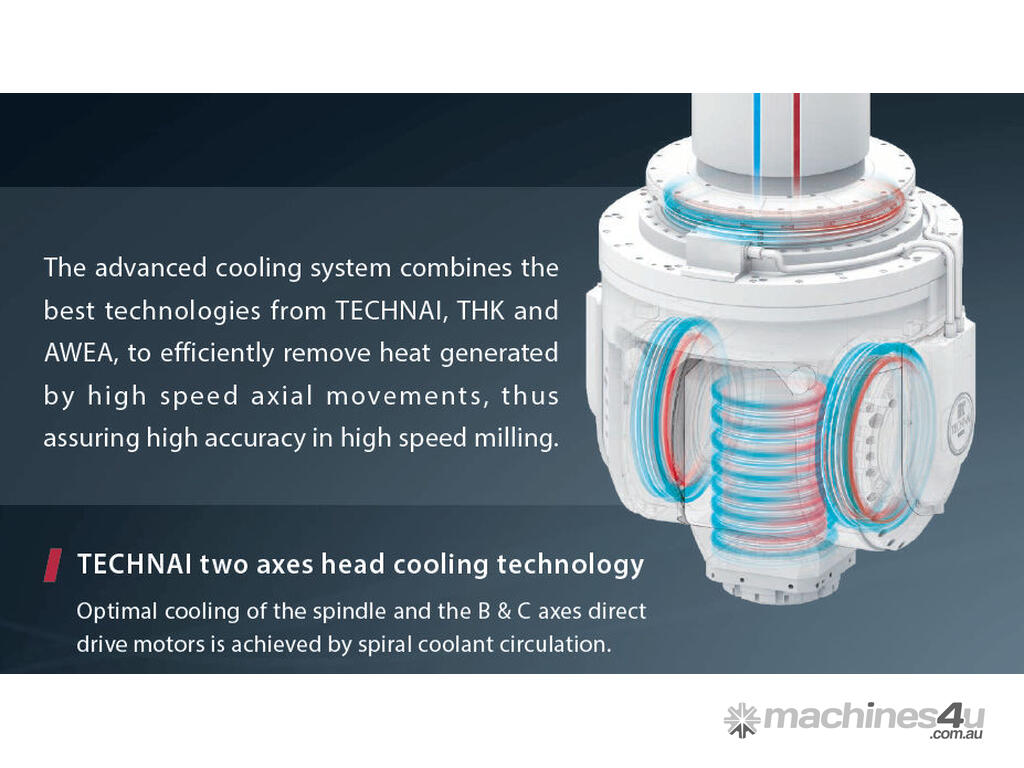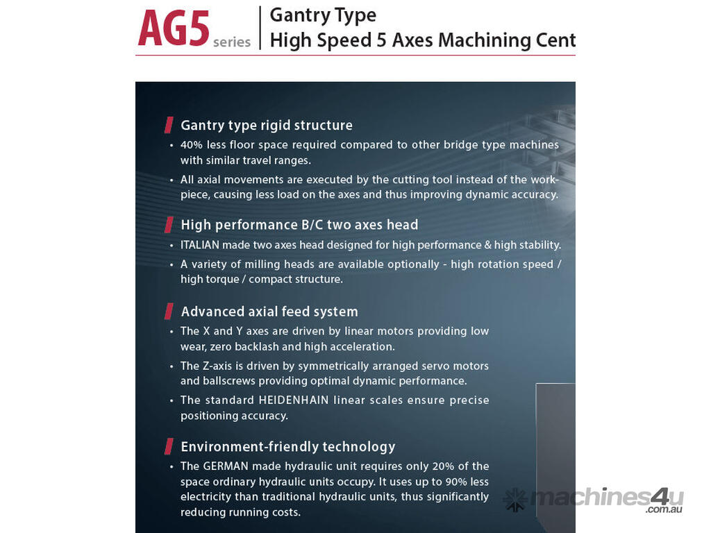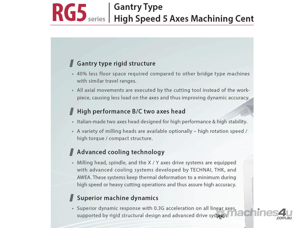 From Awea, the No 1 DMC manufacturer in Taiwan, the ultimate 5 axis , linear motors (AG5) with 60 m/min rapid traverse speeds, large capacity machining capability designed with the integration of the ultimate electro-mechanics and high quality components. The ITALIAN made high performance milling head enables simultaneous 5 axes ( X , Y , Z , B , C ) machining of large, compound angular work-piece machining needs. The AG5 and RG5 are the best choice when advanced machining requirements need to be met. Looking for value without sacrificing quality? Look no further !!!