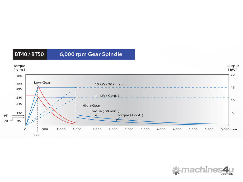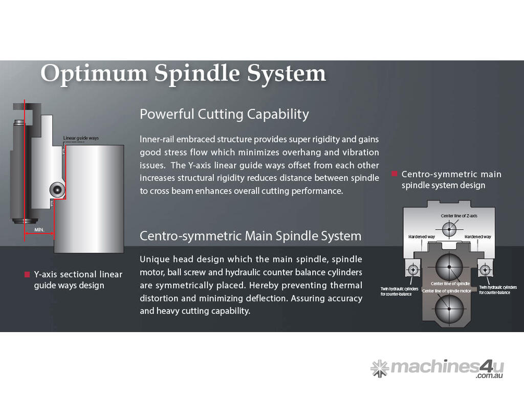 C/w: Gearbox spindle with 382nm of spindle torque, high speed Arm Type ATC, enclosed guards (roof optional) coolant flood ring around the spindle, spindle oil chiller, integrated chip augers and lift up conveyor. Many other options available on request.