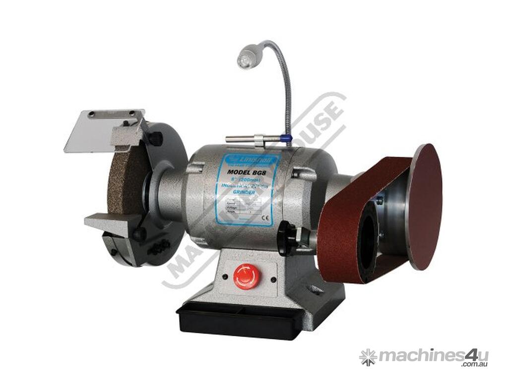 The Linishall BG8-915 Industrial Bench Grinder includes a secure mounting to ensure smooth linishing operation, top platen for flat surface grinding, Ø200mm Medium Wheel, Ø180mm sanding disc, sealed for life bearings, grooved contact wheel to avoid belt hop on lap joint belts and cooler operation, large handle for easy tracking adjustment, a tensioner locking lever designed for easy belt changing, pre-load bearings (no end play) and heavy sheet-metal wheel guards. Includes cast tool rest, diamond wheel dresser, water tray and LED work light. 50 x 915mm abrasive belts are available in a variety of grits and materials to suit grinding such as steel, stainless steel, ceramics, timber, plastics, carbide etc.