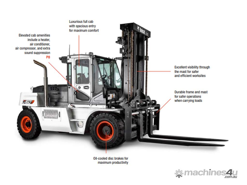 Bobcat's 10-16t diesel forklifts deliver power and reliability with electronic–controlled, low-emission, high-torque engines. The robust chassis ensures durability for any application while the spacious cab offers comfort and visibility. Uptime is improved thanks to longer service intervals.